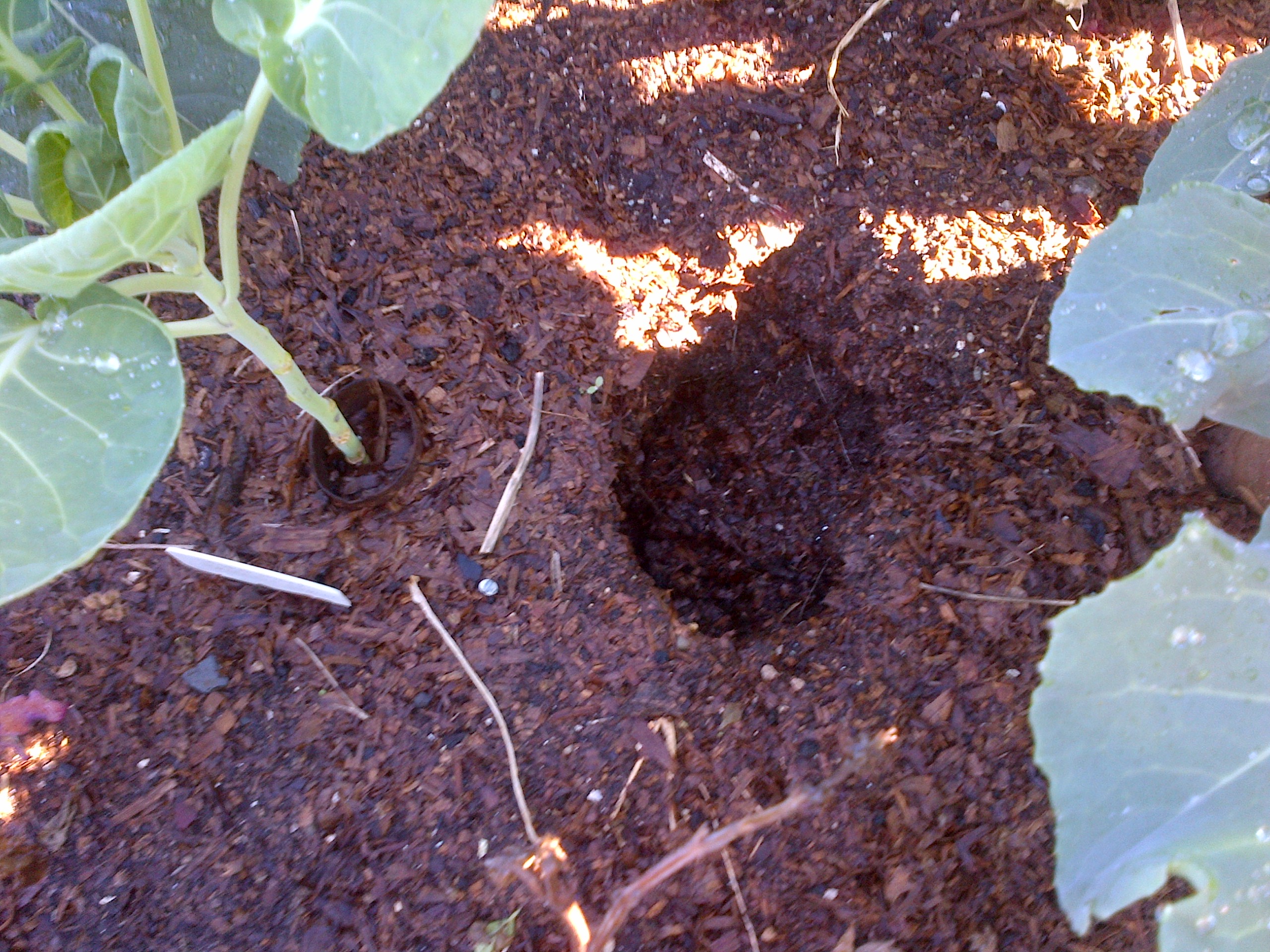 Gopher hole next to a Romanesco plant. Luckily the Romanesco got out alive.