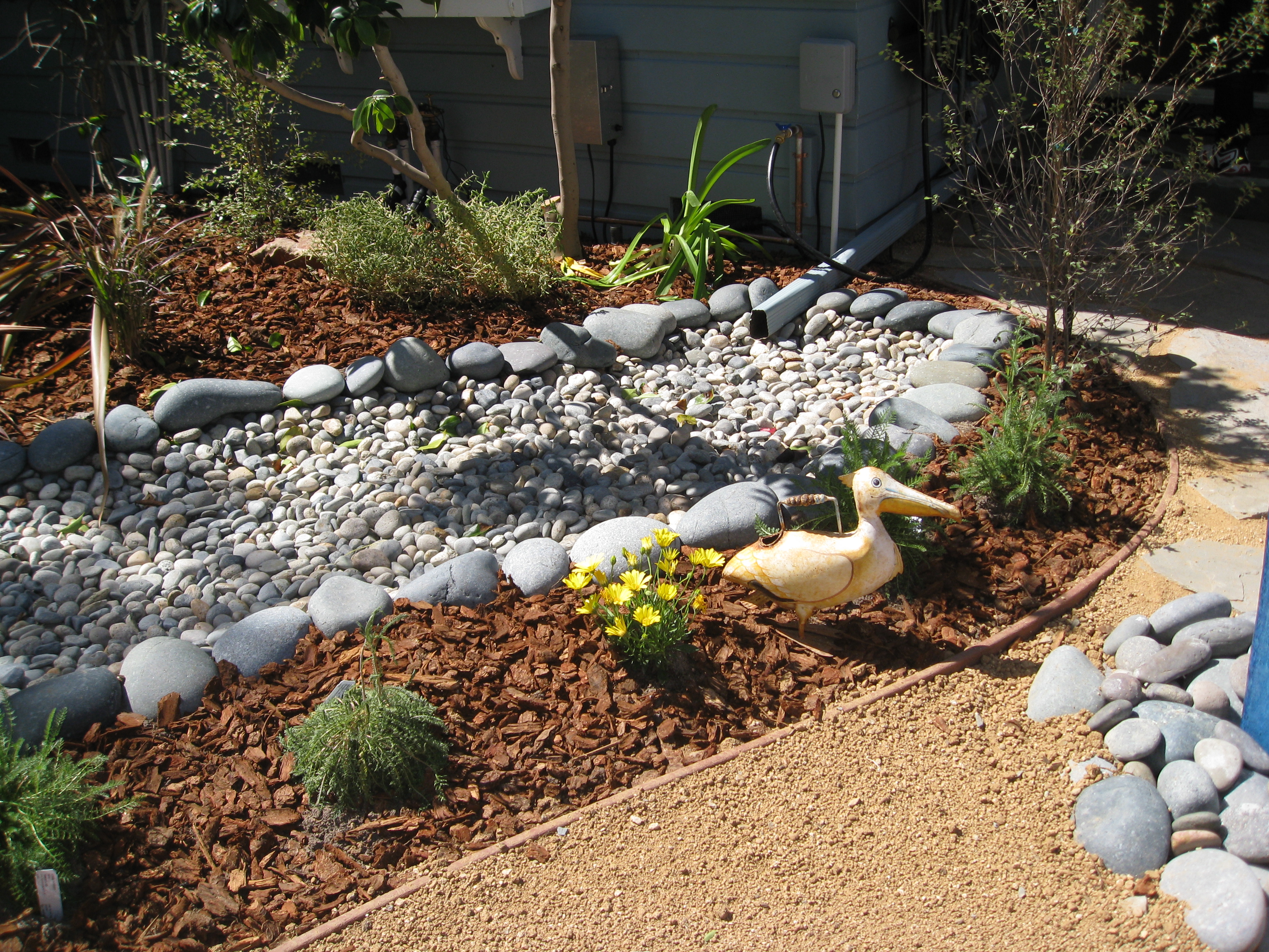 Mulch and drip irrigation will keep water on site instead of running down the street to the ocean. As plants grown in they will spill over borders to create a lush landscape filled with colorful flowers and foliage.