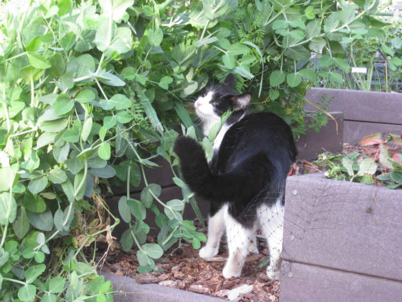 Cats in the garden are often a problem. They love to use empty raised beds as litter boxes. Mittens did too, but as with most cats, as soon as you plant the bed they stop. For persistent poopers, bird netting helps deter them (little paws get stuck – an undesirable side effect). For even more determined defecators, these Cat Scat devices work well.