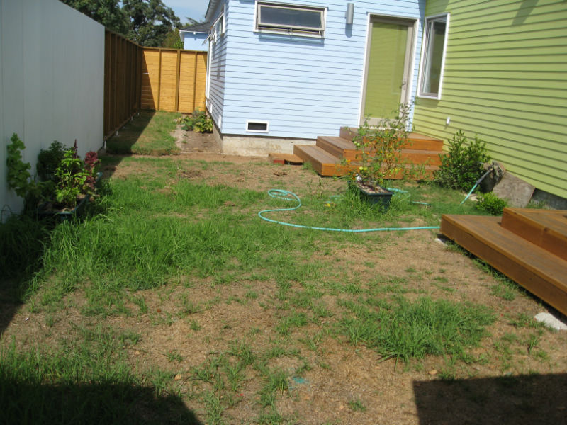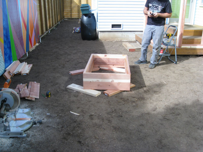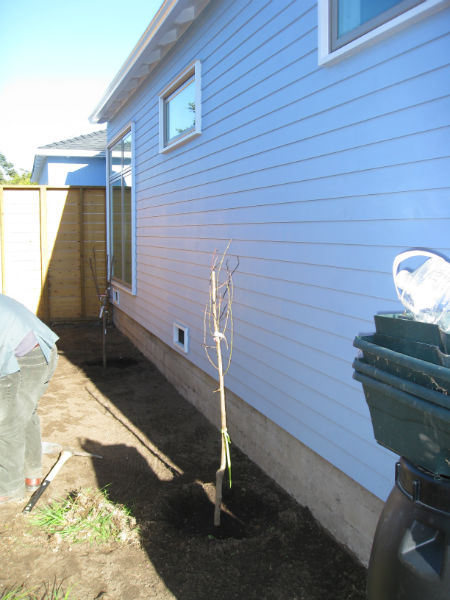 After clearing all the old grass and concrete, we went to work building the new beds and planting a couple bare-root fruit trees along the long, narrow strip of side yard (behind rain barrel).