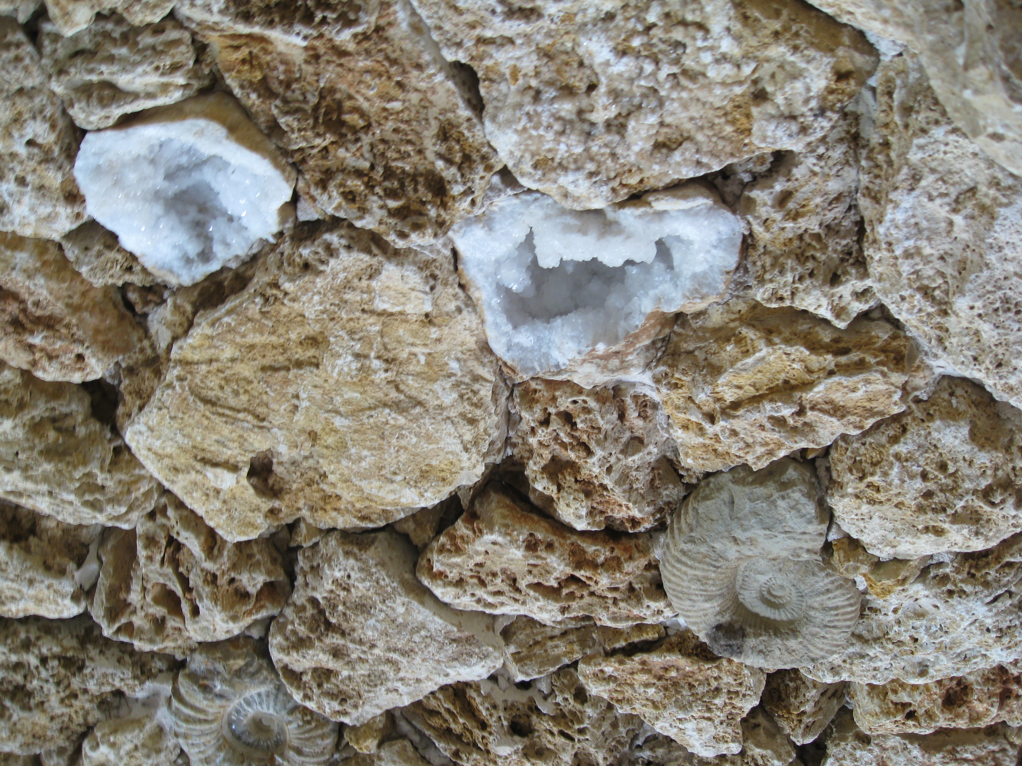 Under the waterfall is a manmade cave with geodes and sculpted fossils.