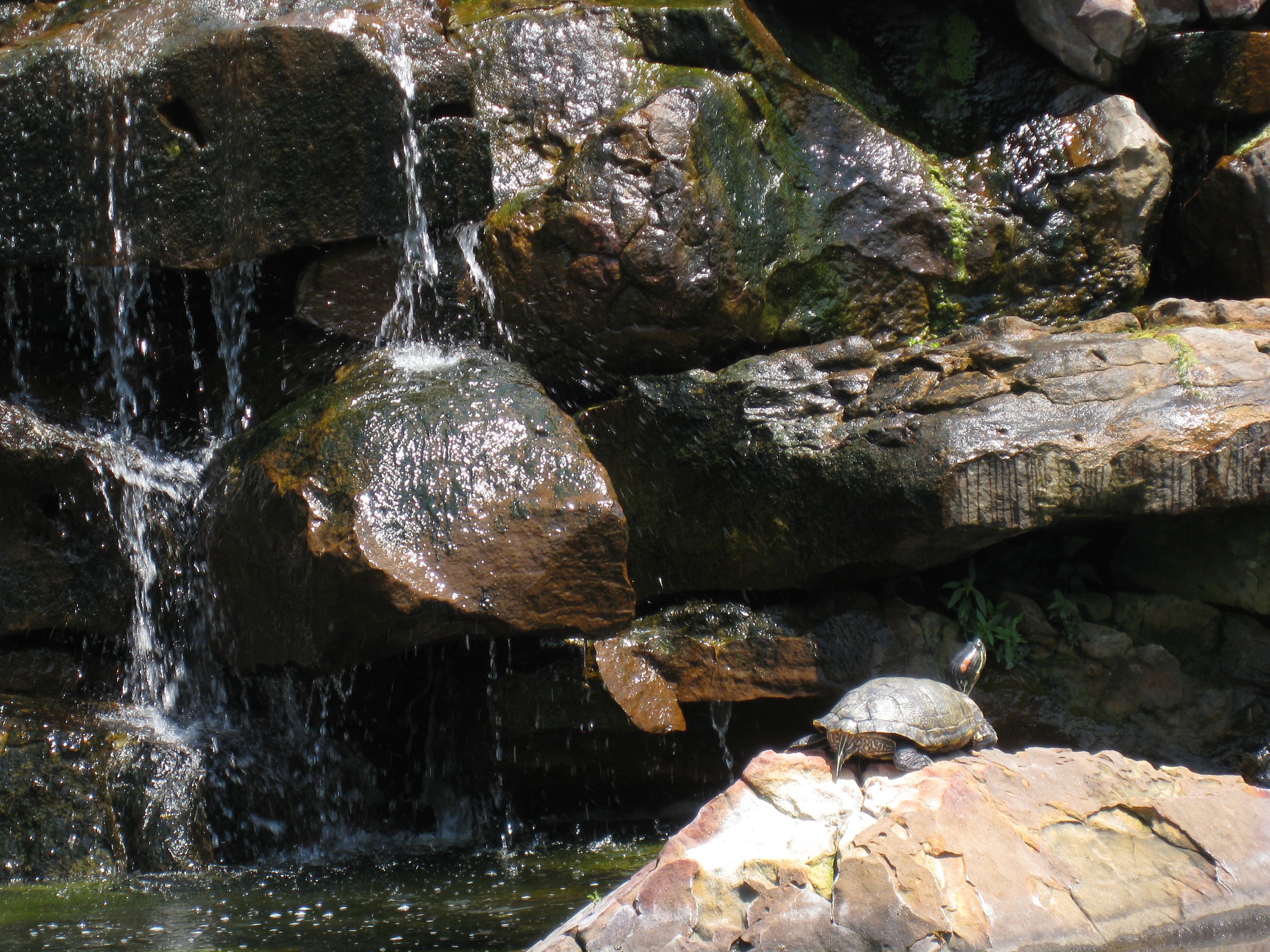 Waterfall and koi pond make a cool rest stop on a hot day.
