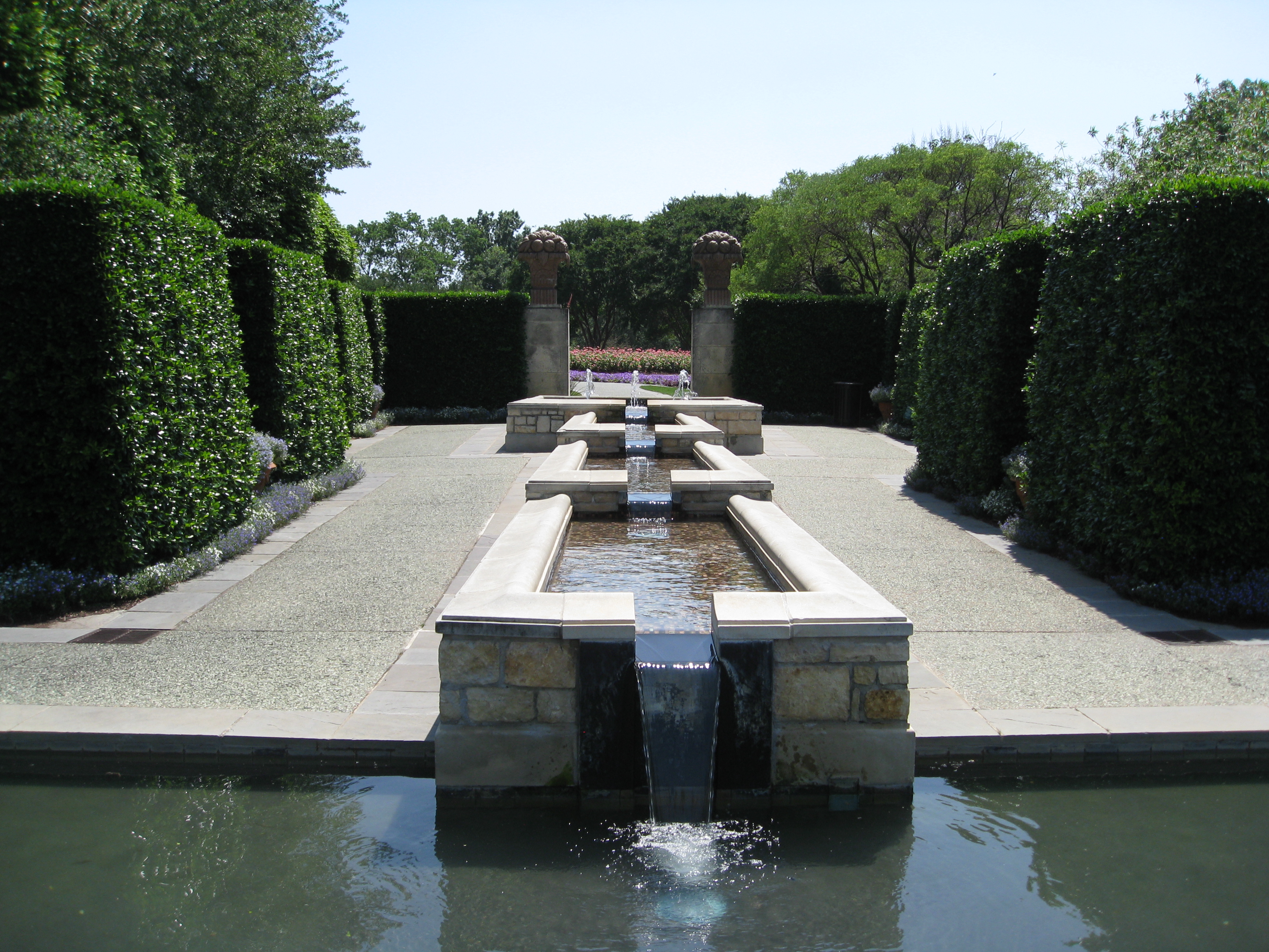 Woman's Garden fountain with formal hedges surrounding.