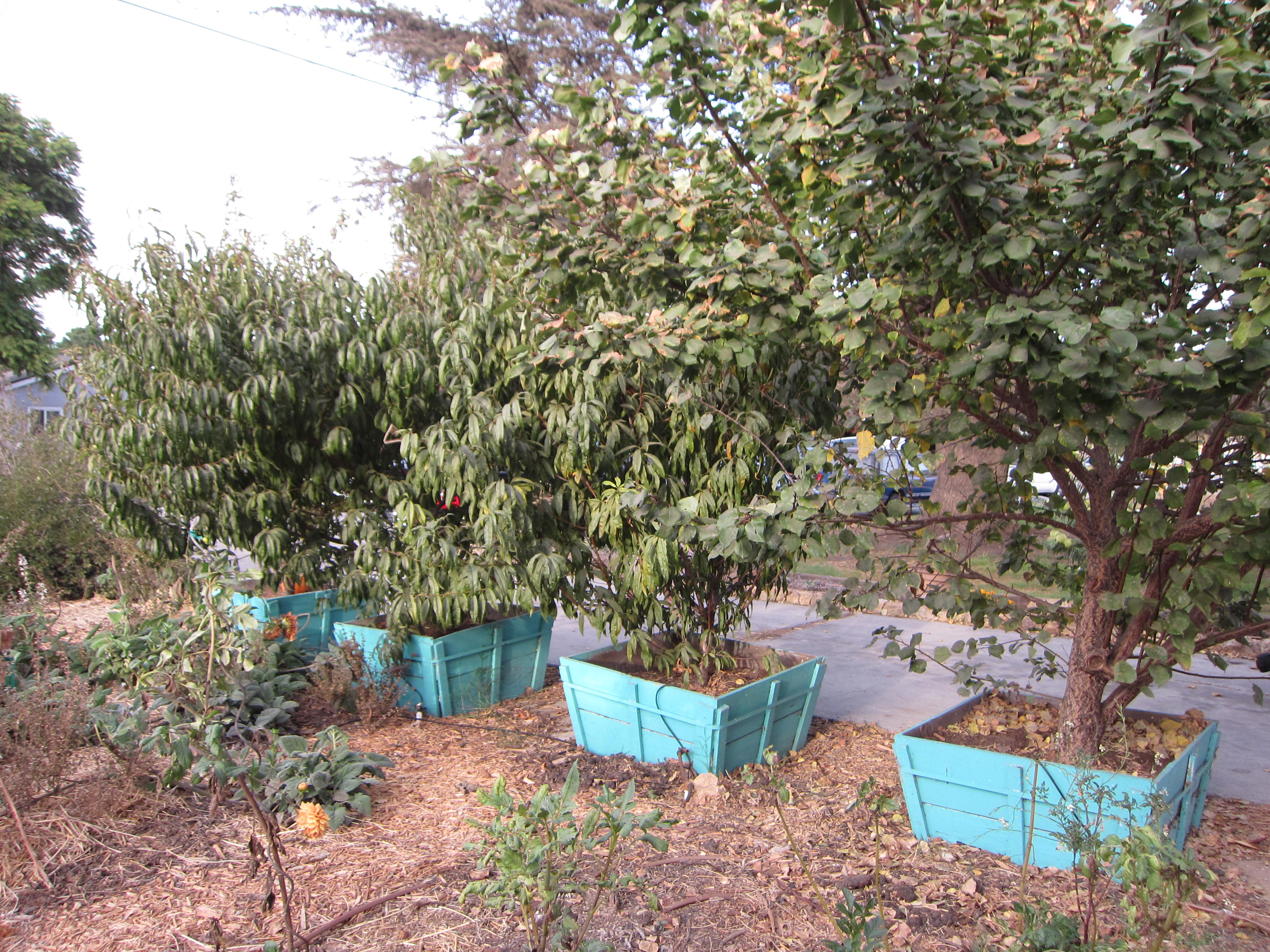 Three compost bins process garden and animal waste into fertilizer for the garden. The bins are discretely hidden from the rest of the property.