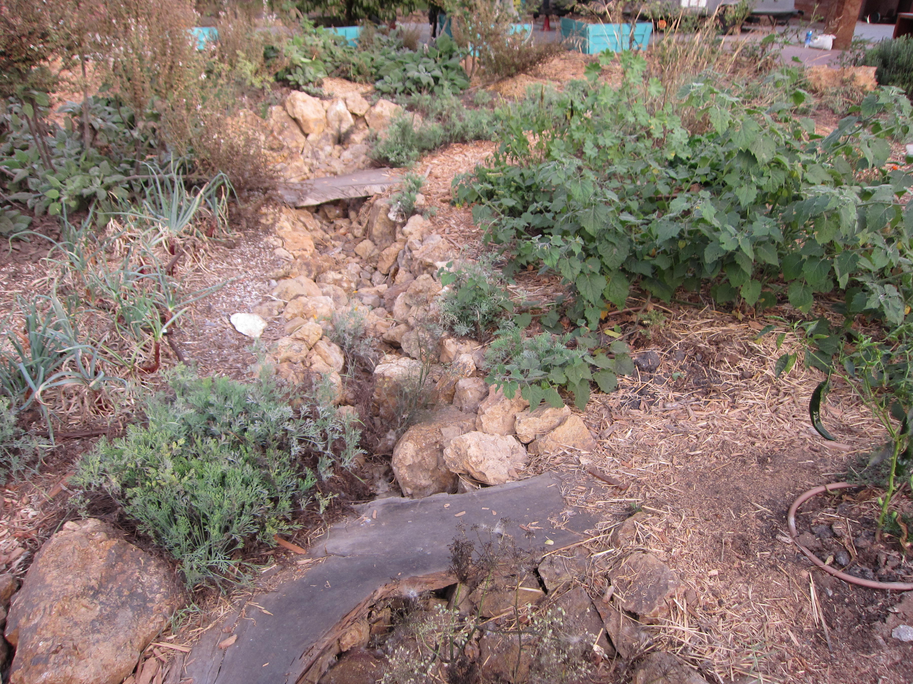 A bioswale captures water when it rains. The dry garden surrounding it soaks up water during the rainy season to survive the rest of the year.