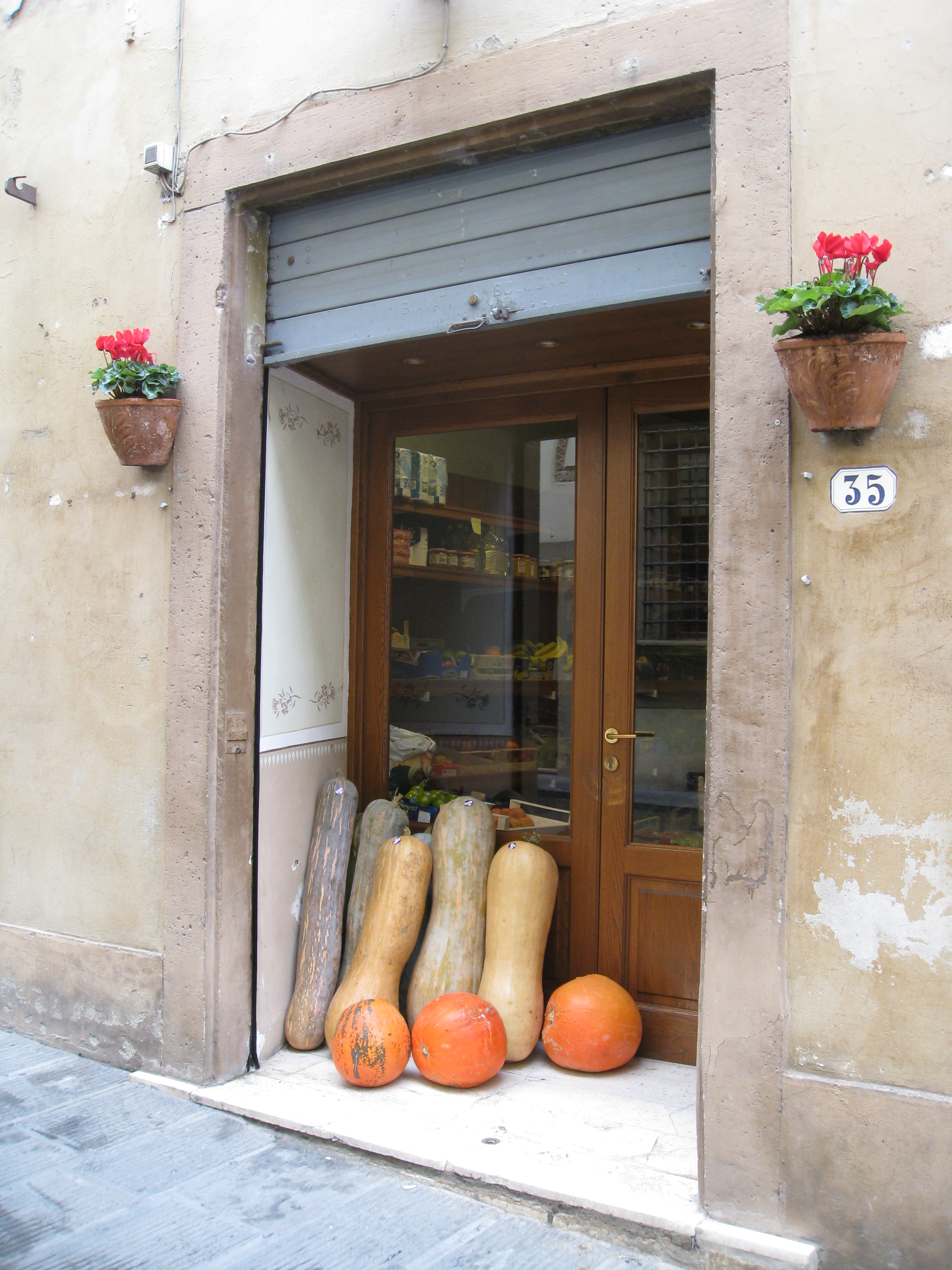 Giant squash decorate the store front for fall in Colle Val D’elsa.