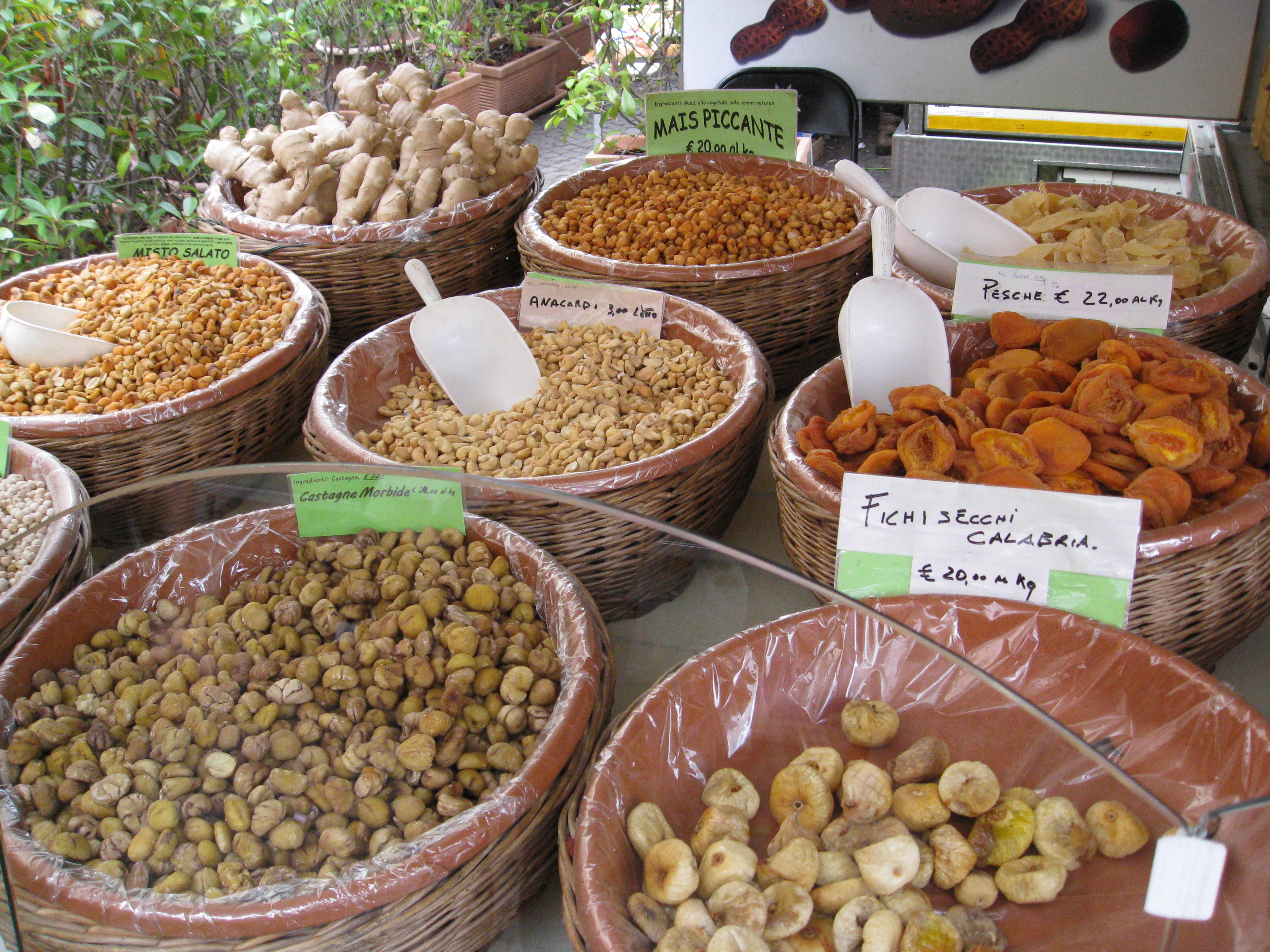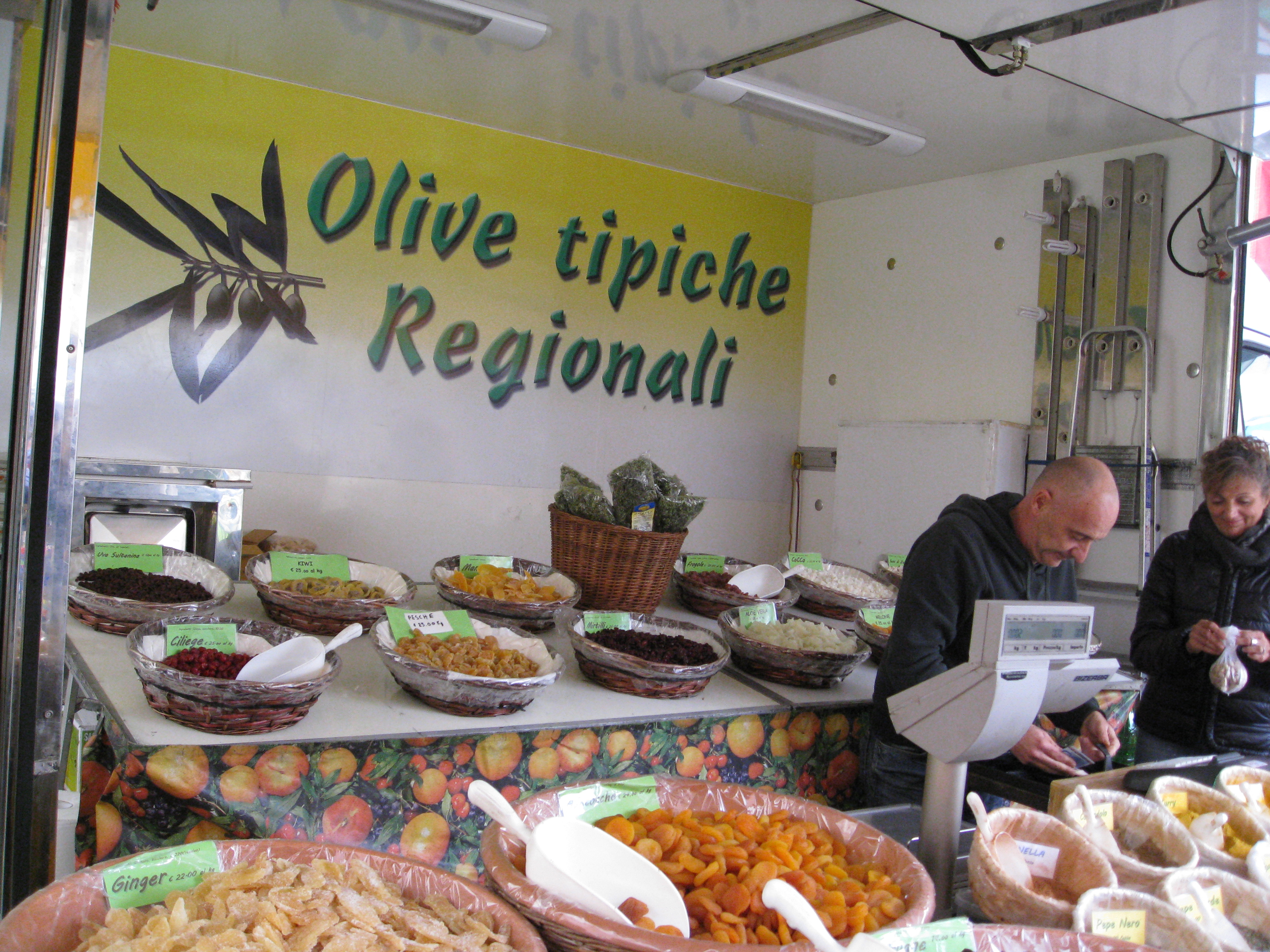 Fruits and nuts at a farmers market in Greve in Chianti. Oh, and that sign means they have fresh olives.