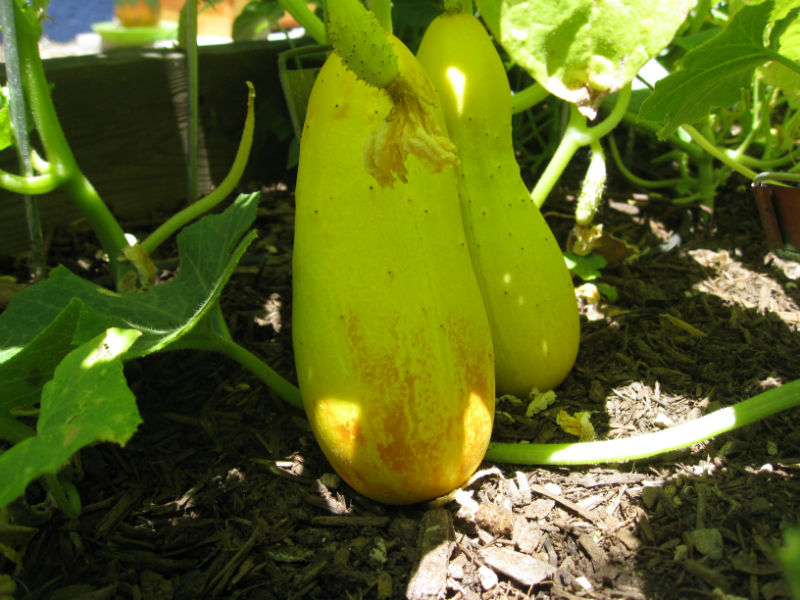 Our seeds came from Baker Creek Heirloom Seed Company, but you can also get them from Seed Savers Exchange and many others. We planted our crop on a trellis along with some Armenian cucumbers (last year’s experiment that did very well). We conditioned the soil in a raised bed before hand to incorporate an inch or so of compost and planted seeds directly. As per usual, the first round was eaten by critters, so we stepped up our game and covered the new seedlings with cloches for protection. Worked like a charm.