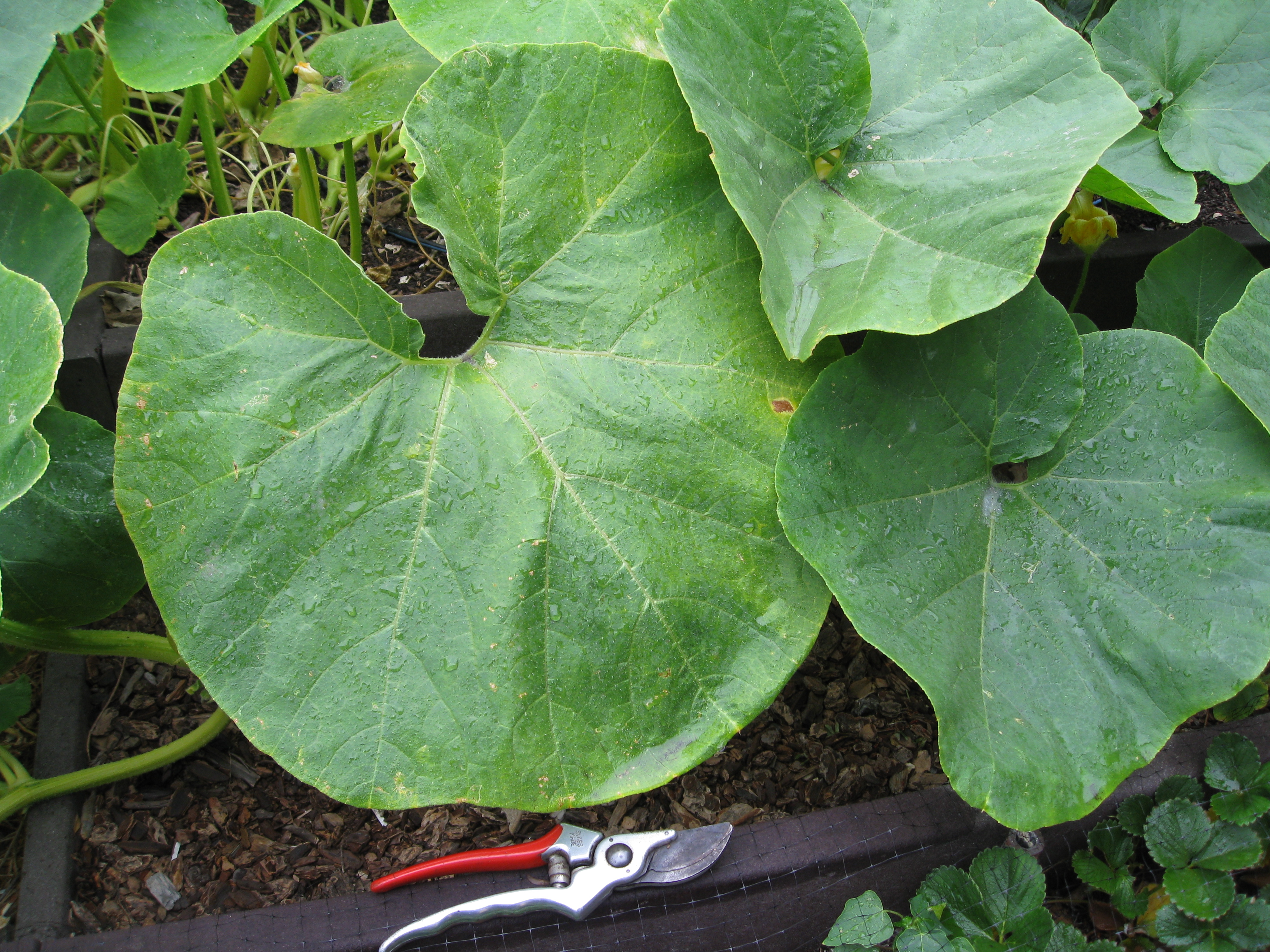 The first thing you’ll notice about Turban Squash is gigantic leaves, the size of large lily pads.