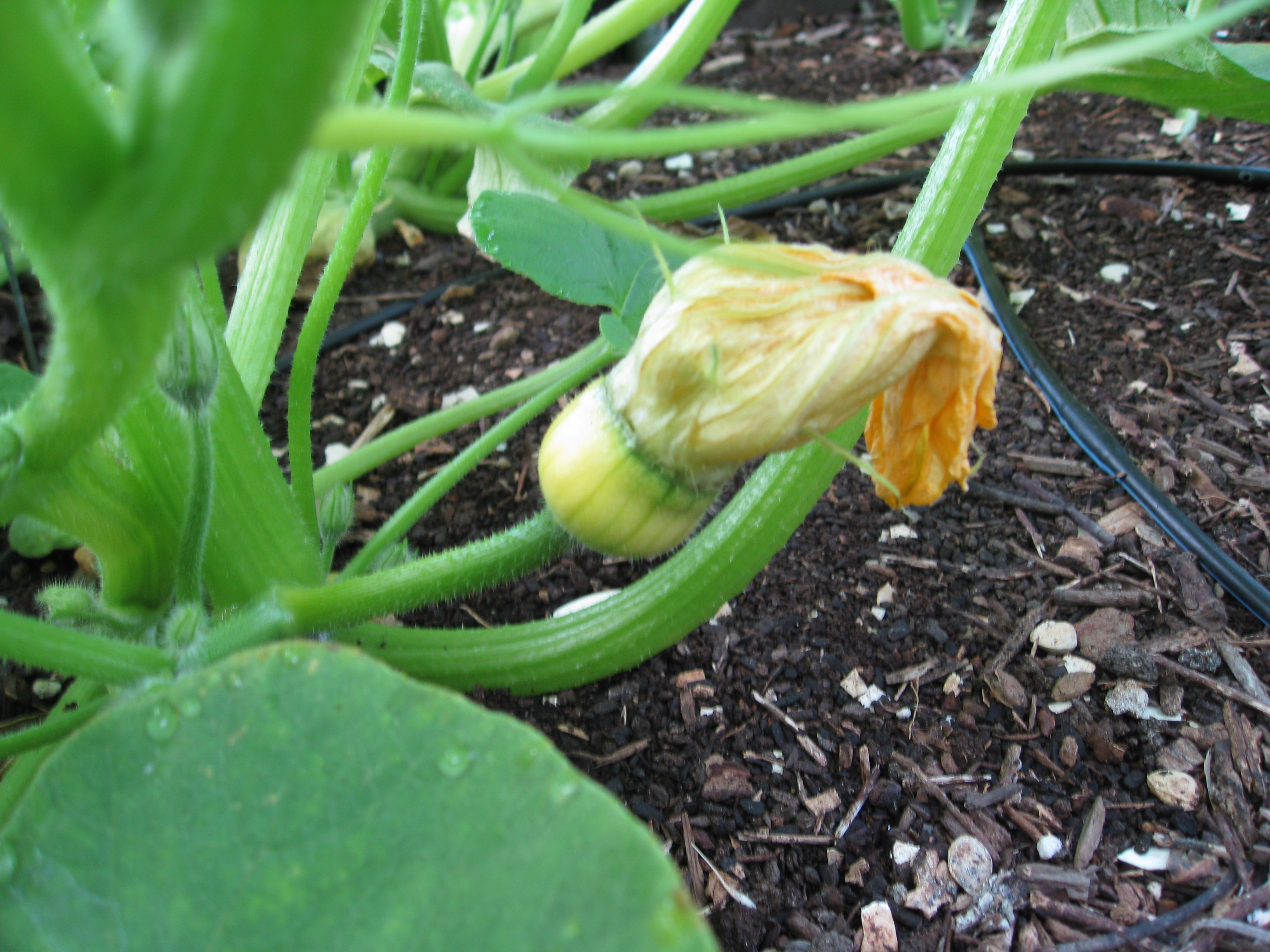 Seeds should be planted on hills 6 feet apart, so the guidebooks say. We do things differently around here because we have sandy soil. Hills are for clay soil. Depressions are for sandy soil. We also don’t space our squash that far apart. We grow 3 different types (a pepo, a maxima and a moschata so they don’t cross pollinate) in the same 4×4′ bed, spaced apart on the points of a triangle. Works like a charm every year. Plant seeds 1″ deep in well-amended soil. We added worm castings and compost, and feed monthly with compost tea.