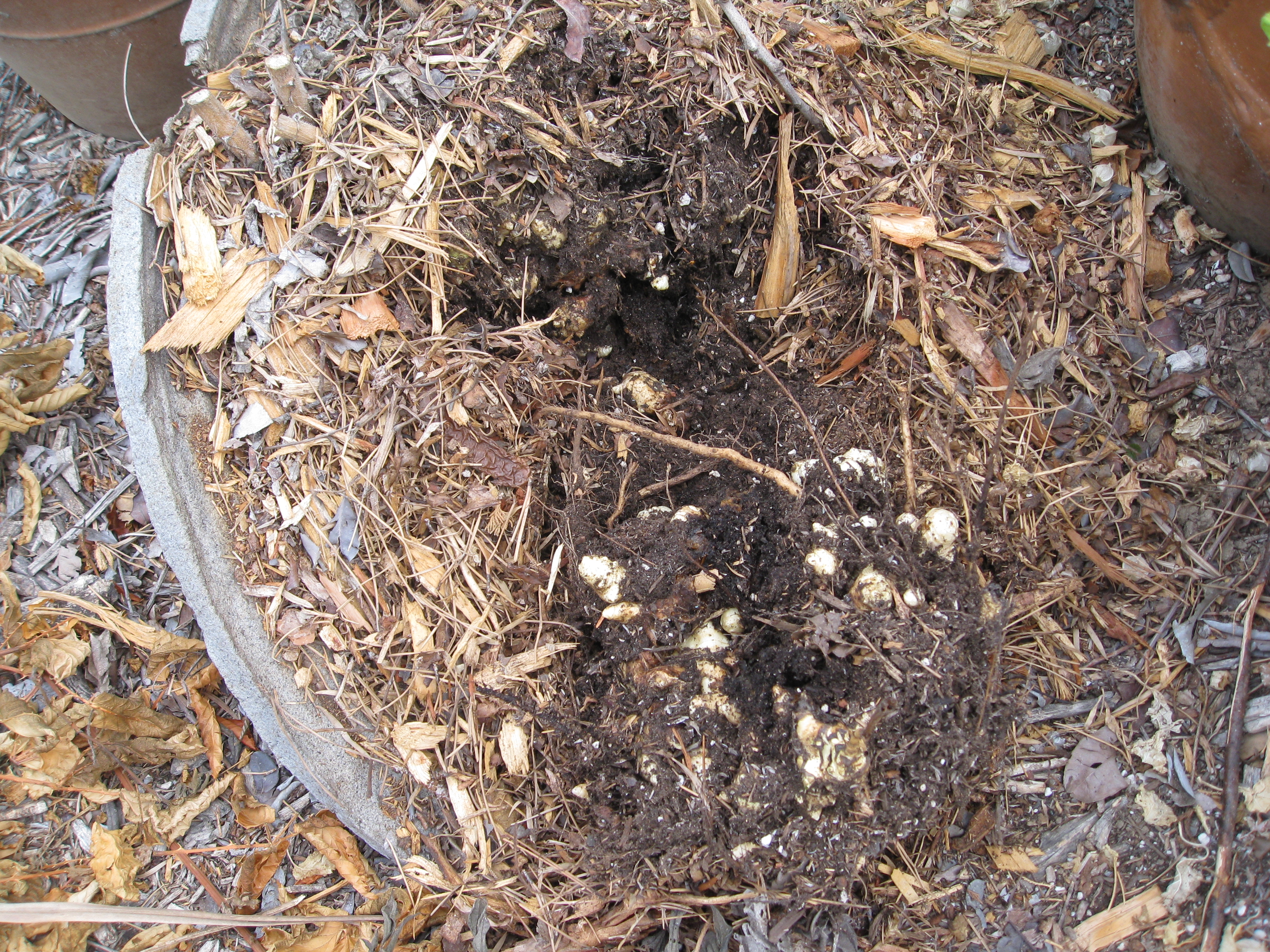 The flowers on our massive sunchoke stalk are long gone and the leaves and stems are crispy brown. The biodegradable pot has all but disintegrated, making it easier to harvest. Let’s see what’s inside?