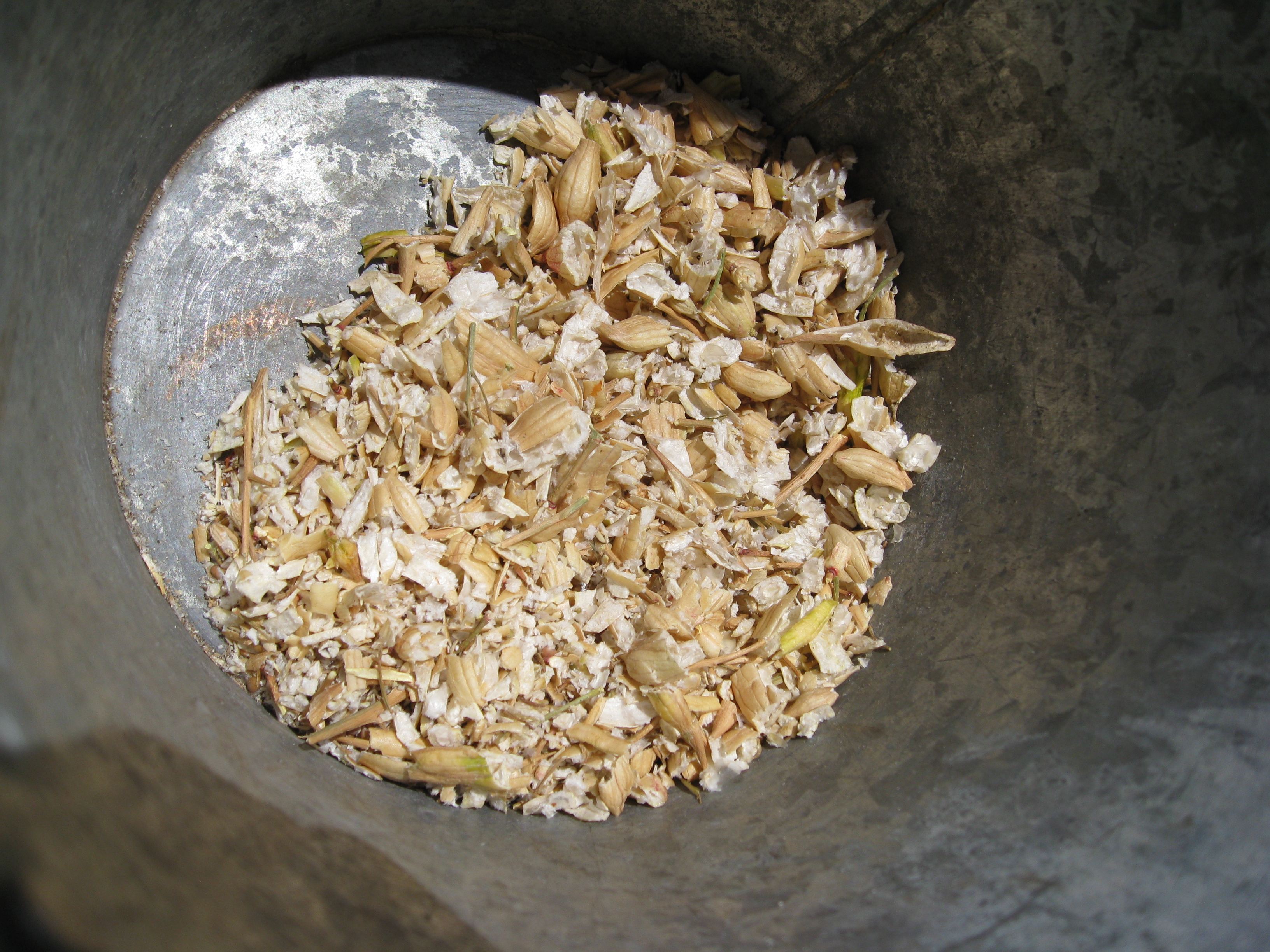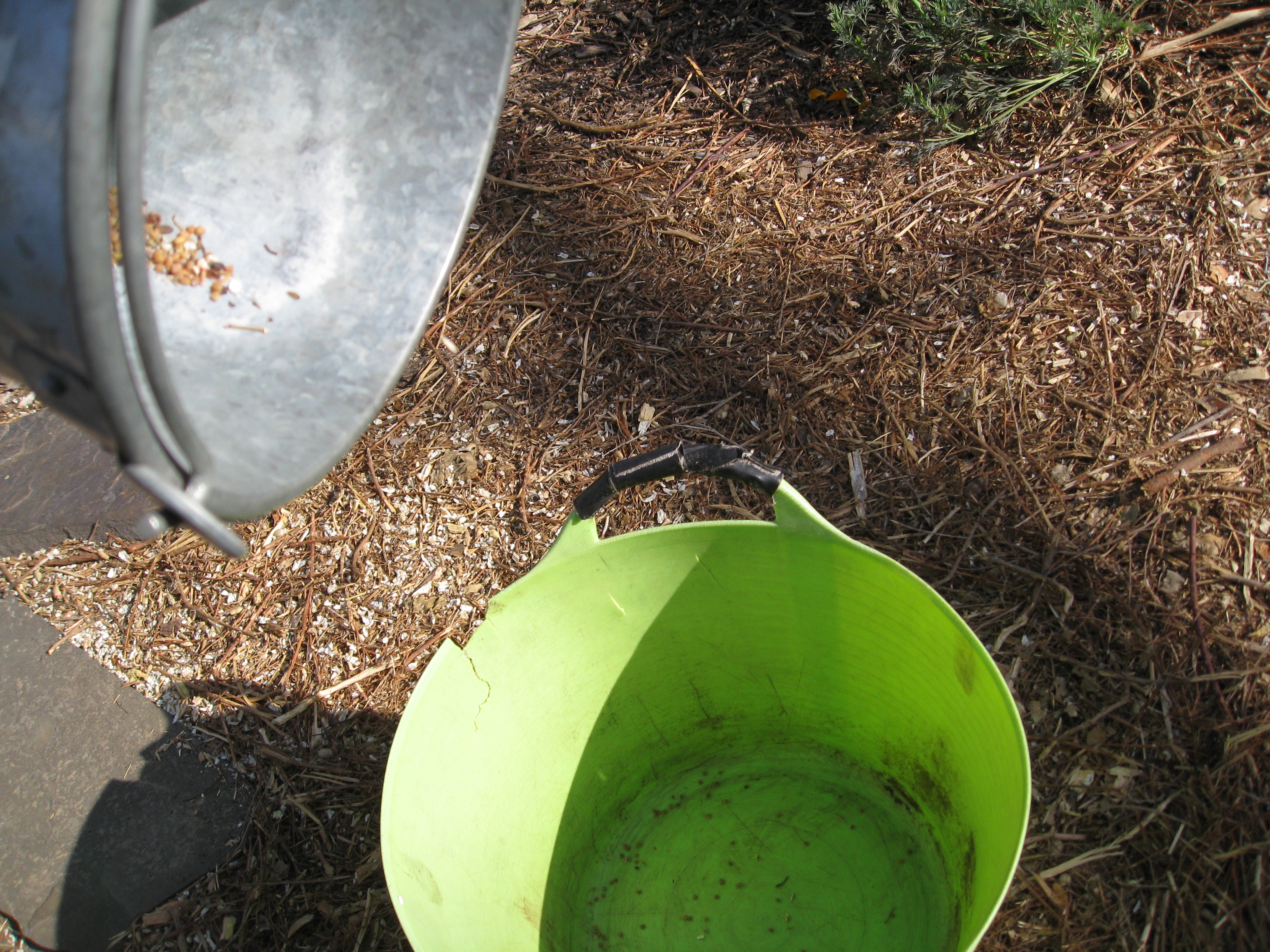 This is the fun part. Get two buckets and a box fan, or a breeze. Pour the seeds slowly from one bucket to another and watch all the chaff float away. Repeat several times. It really works, except when a wind gust suddenly shifts and you end up with half your seeds in the mulch. Here’s that tip we promised earlier: Put a catchment basin under your bucket. Details.