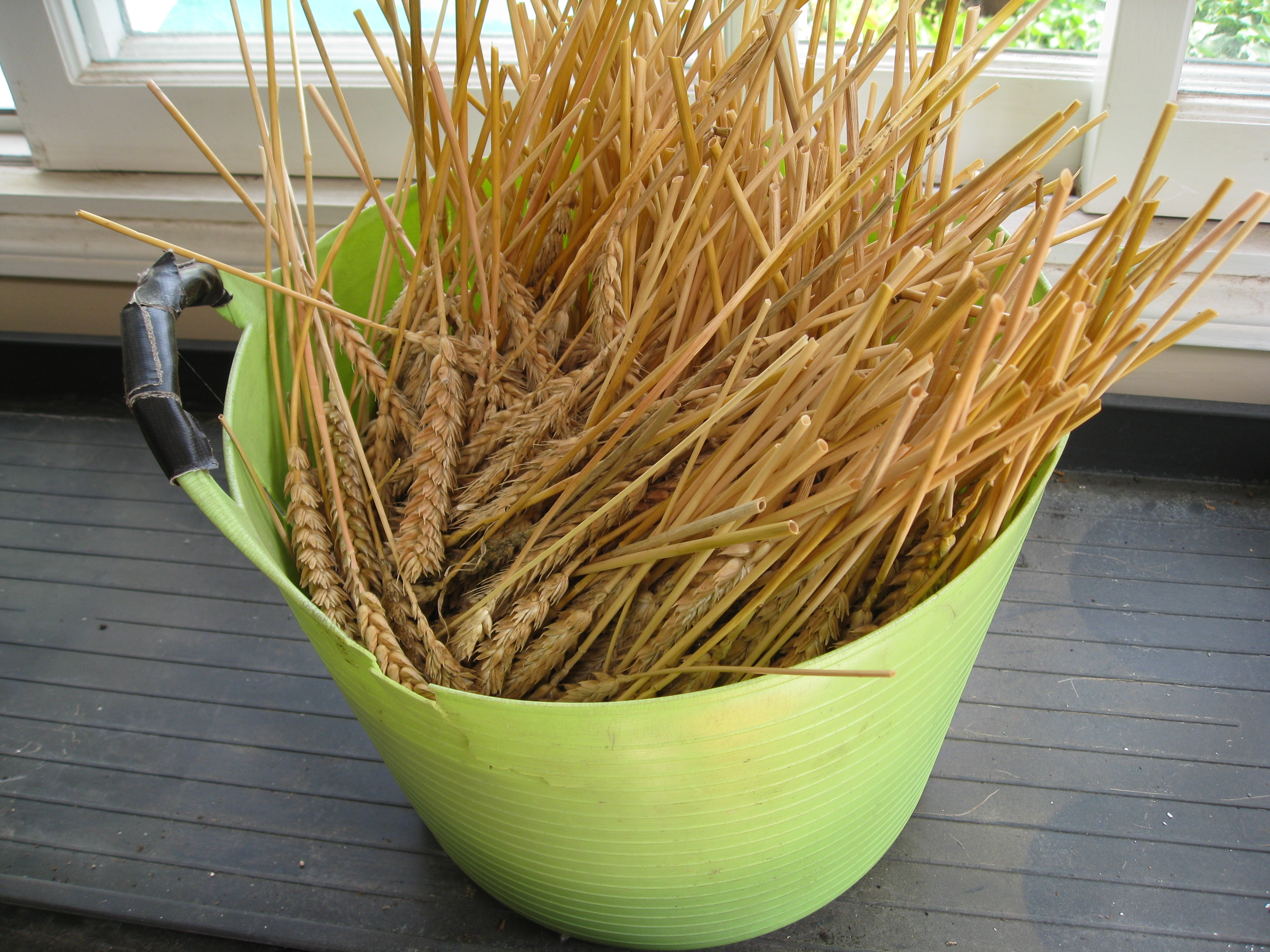 Take bundles of wheat and place the stems under one foot in a trough like this…