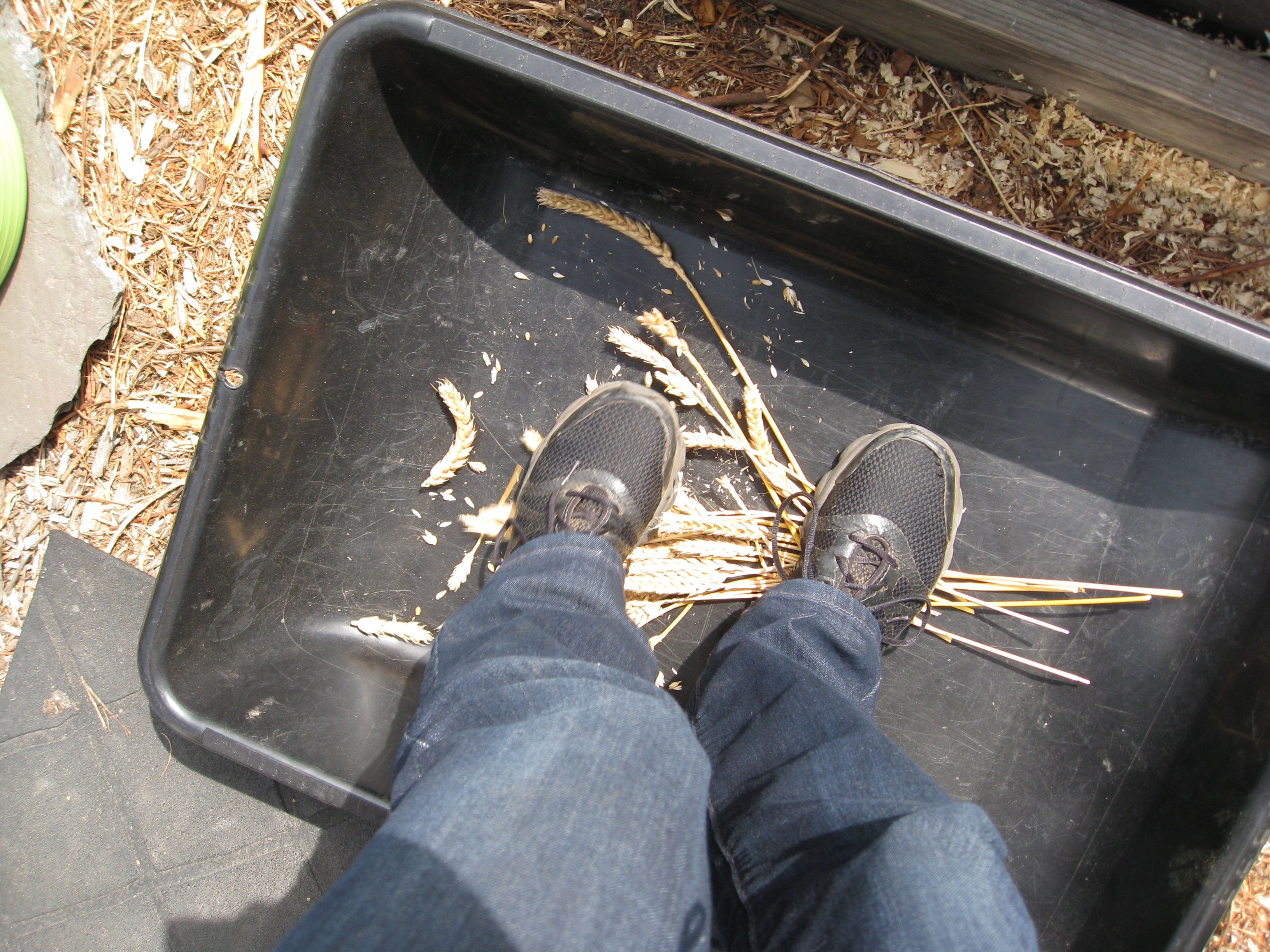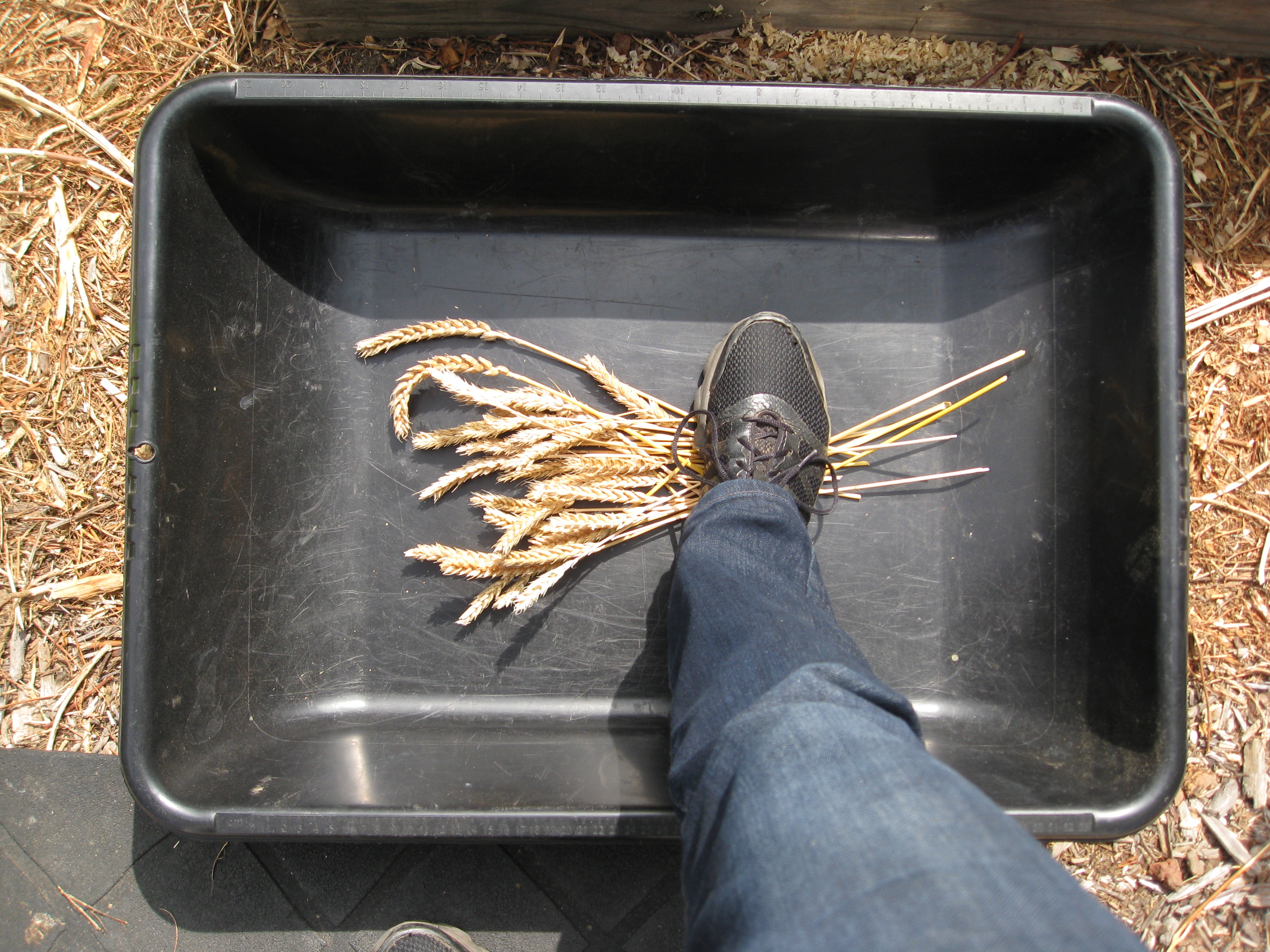 4) Threshing – Small-scale threshing is best done with a thresher like this, but since most of us aren’t going to invest in a piece of equipment for one job (though after doing it by hand you might think differently) we’re going to share the “slow-food method.”