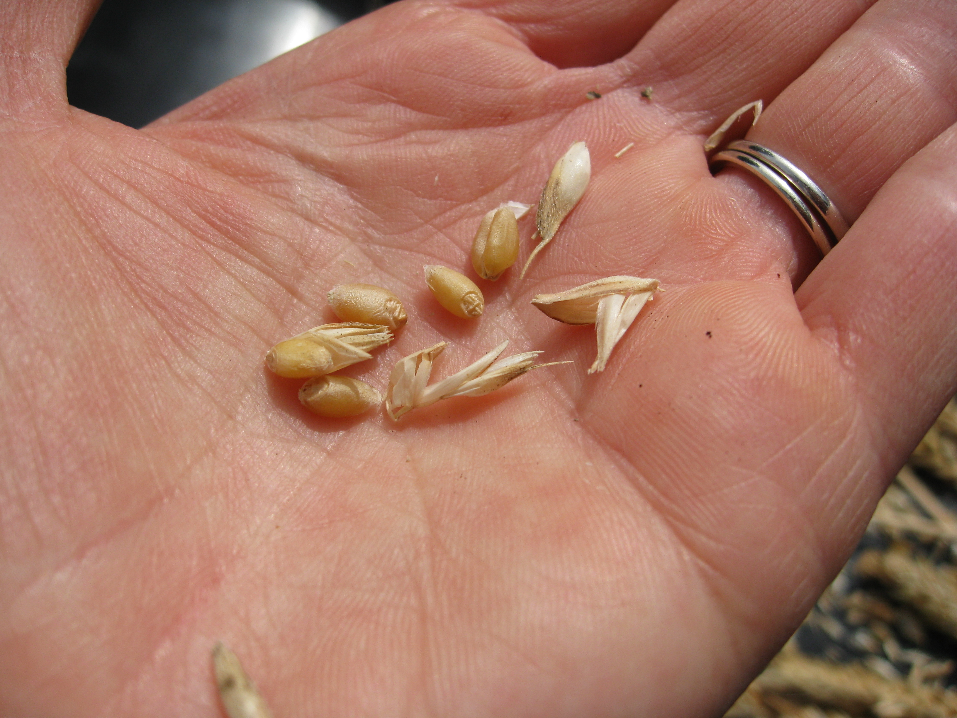 The result, after burning many calories, is loose grain and plenty of chaff. There may still be a few grains stuck inside their sheath. Friends of ours have said the best thing to do is put on a good movie and pick out individual grains while you watch.