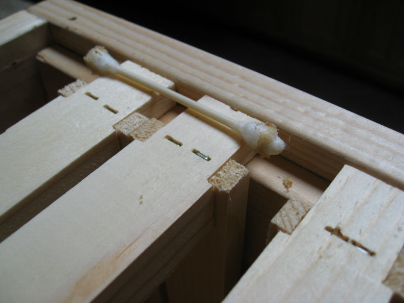 Inside the swarm box was a place to hang a few starter frames. We were instructed to place a couple cotton swabs with lemongrass oil on top of the frames at the rear of the box. After drawing a line of bees wax across the upper rung of each frame, we placed the bait and closed up the box.