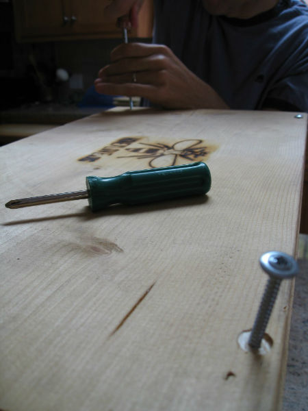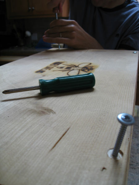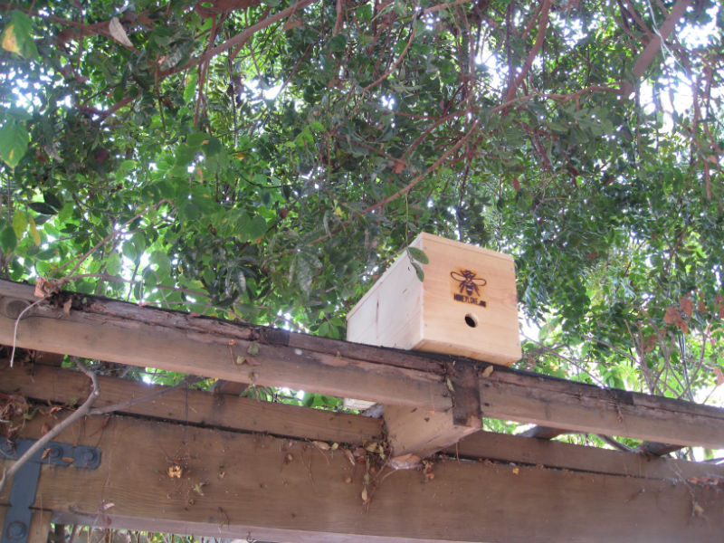Now to place our box. Most people secure the box in a tree for bees to access without interference. We have a giant Brazilian Pepper tree that is covered with bees every morning–they are busy pollinating its thousands of tiny flowers this time of year. Rather than go through the trouble of finding a level place to wedge the box, we decided to use the patio pergola, which sits under the canopy of the tree.