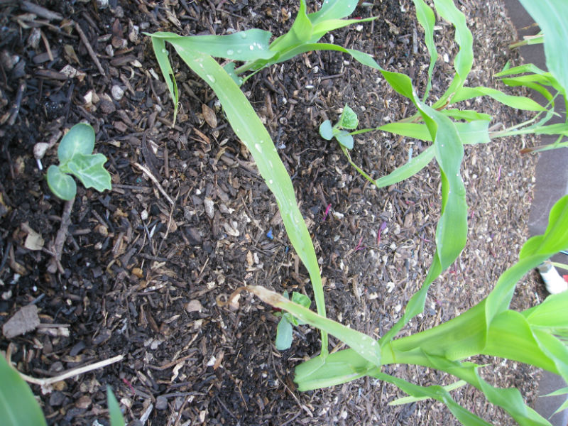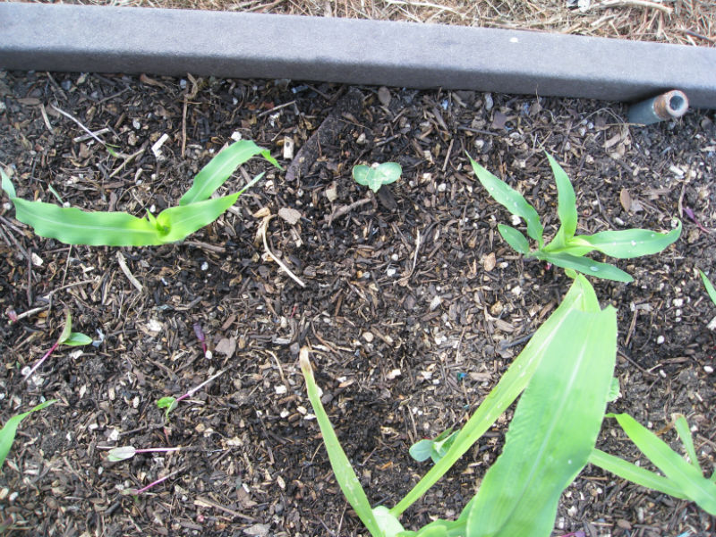 We’ve also allowed nature to interplant for us. This year’s corn bed was the home of last year’s cucumbers, which seem to have sprouted up in the soil from seeds left behind. We’ll see what happens as they grow in together.