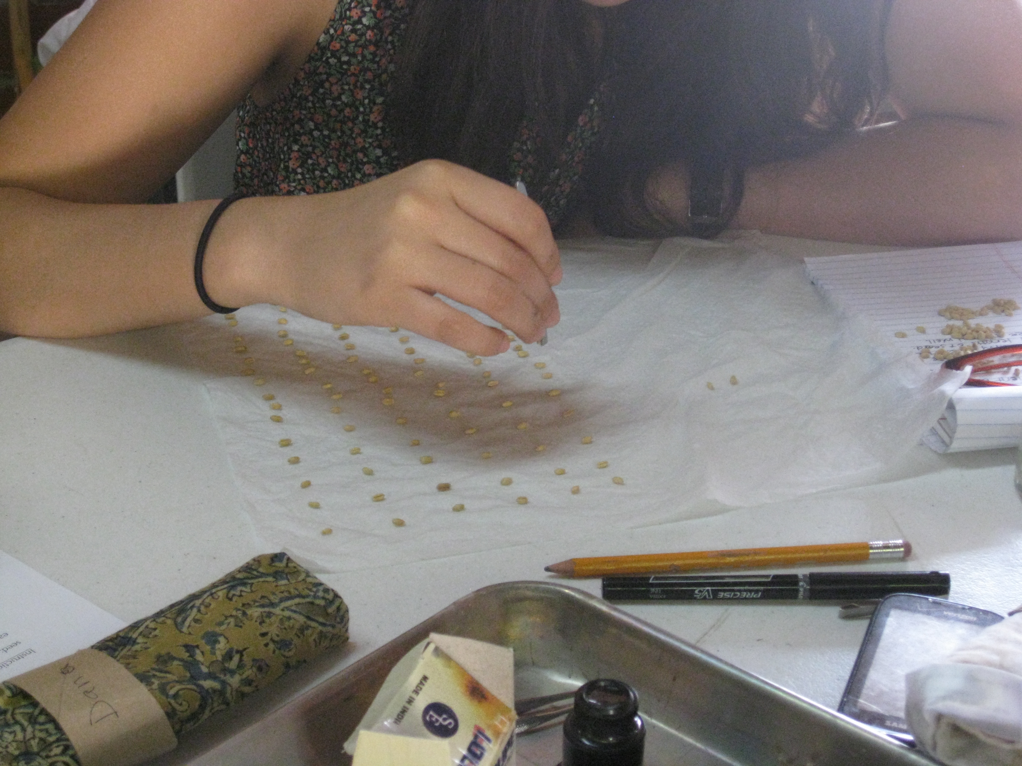 After a moment of panic, I reminded myself to start with what I know. Beans. Okay, that’s easy, there were two of those. Then a melon seed, and some corn. Okay, not so bad. Onward…