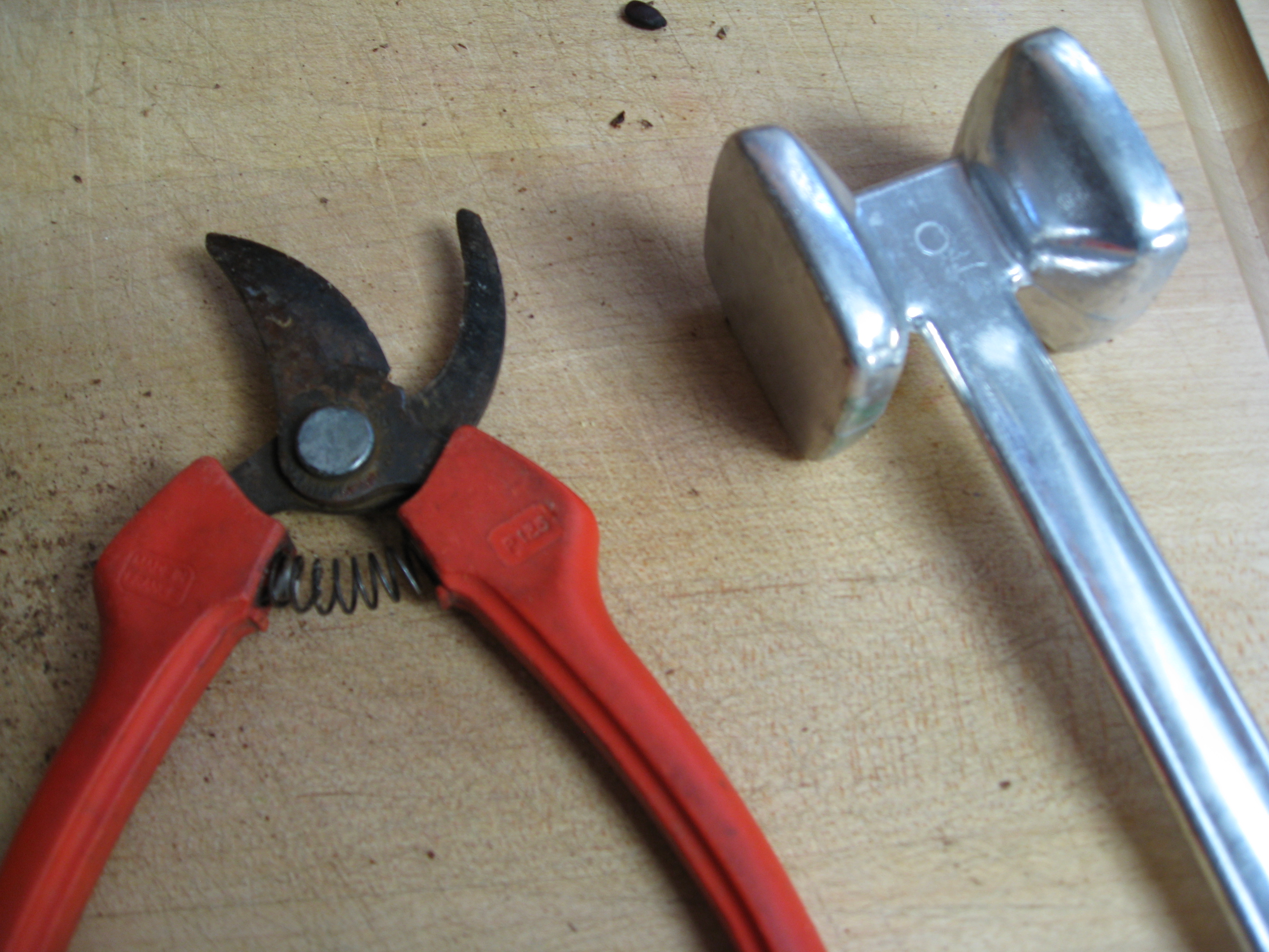 You’ll need a hammer or meat tenderizer and a pair of garden shears for the next part.