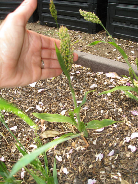 We planted millet in late February and planted it out last month and already we have an update! While many of the plants were destroyed by curious cats, the remainder have sent up impressive stalks of grain.
