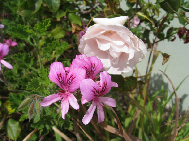 One of many roses and a lime geranium in flower