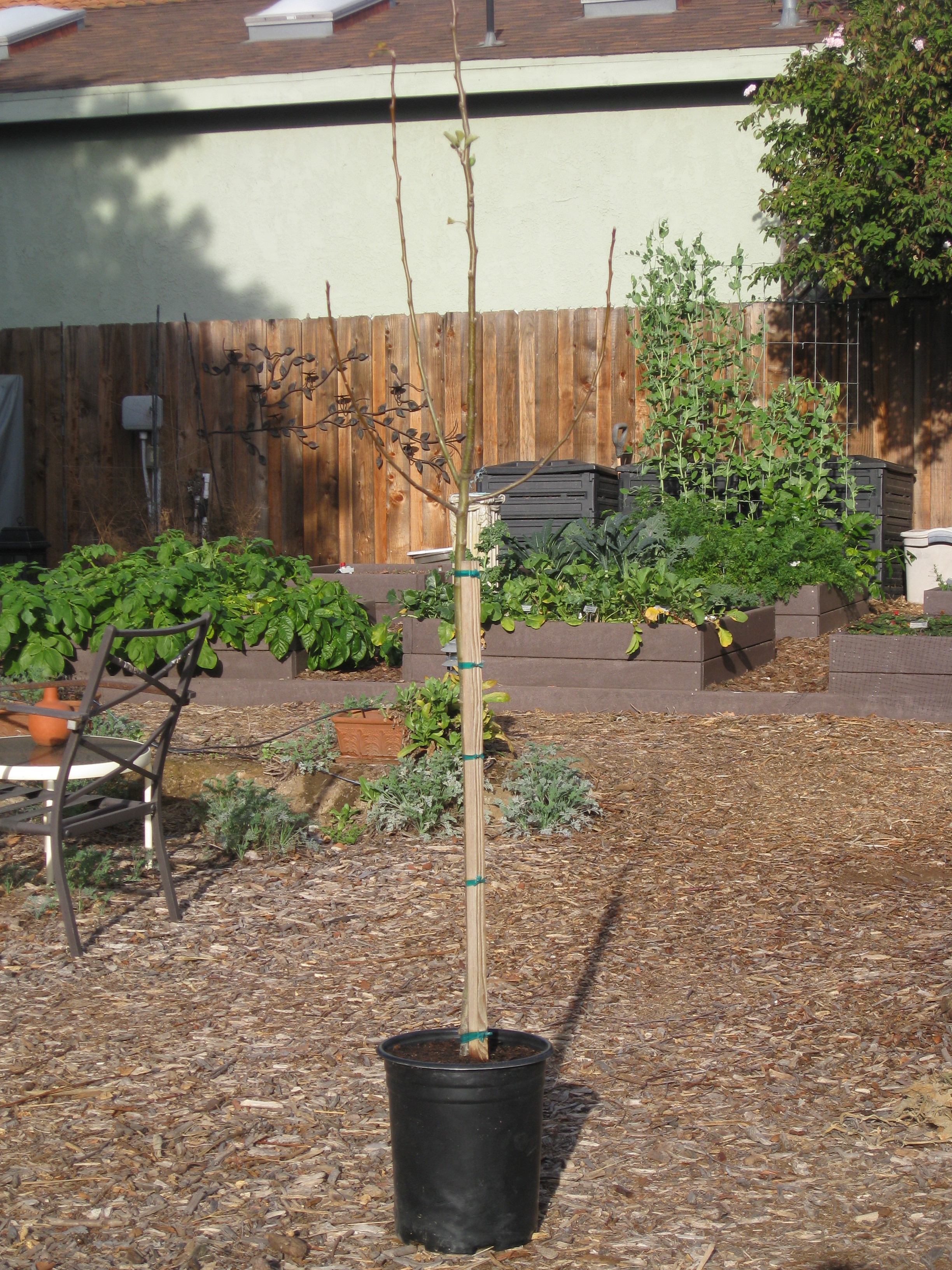 The program ordinarily gives away up to 7 shade trees per household, delivered to your door if you qualify, but on occasion they give away free fruit trees. Believe me, these are far more popular and the line down the Market proved it. Yours truly got there early (I’m no fool, I was third in line) and picked up a Fuji apple tree (it has low chill hours, so we’re hoping it works here).