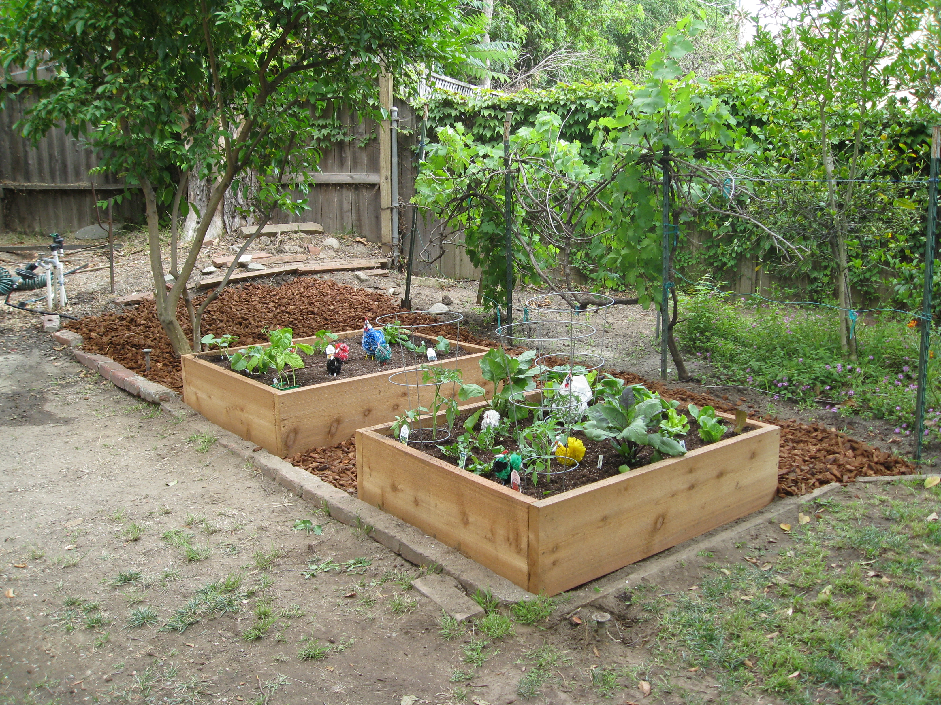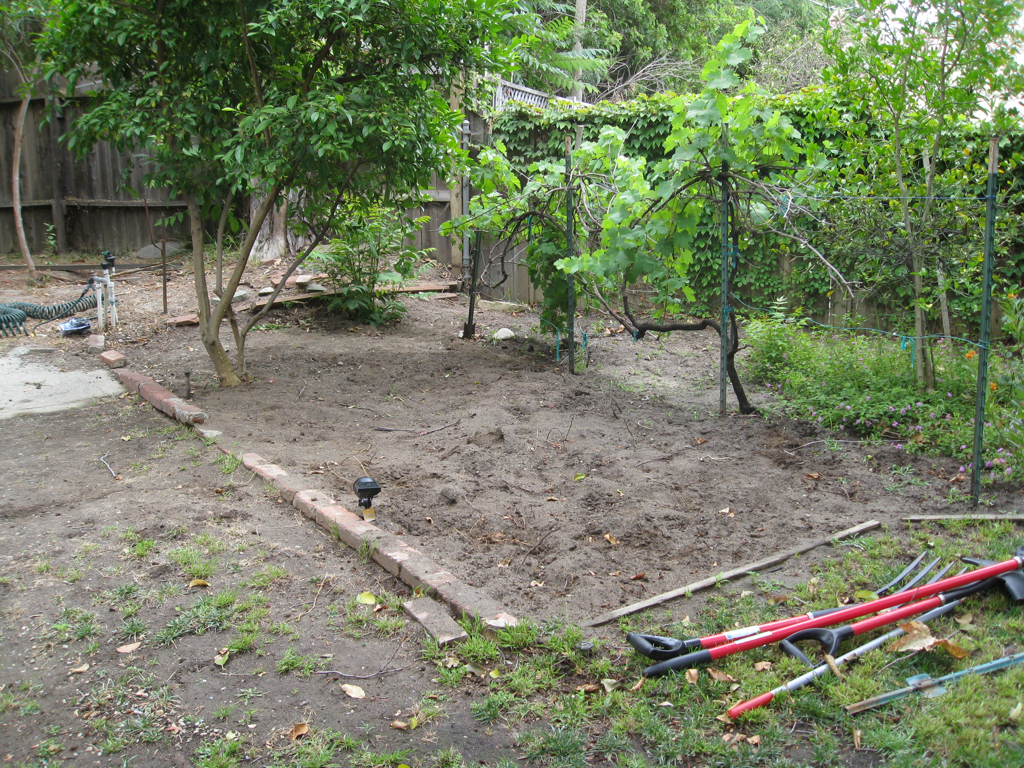 A citrus tree and grape vine form the boundaries of the garden space. Roots from nearby trees make digging difficult.