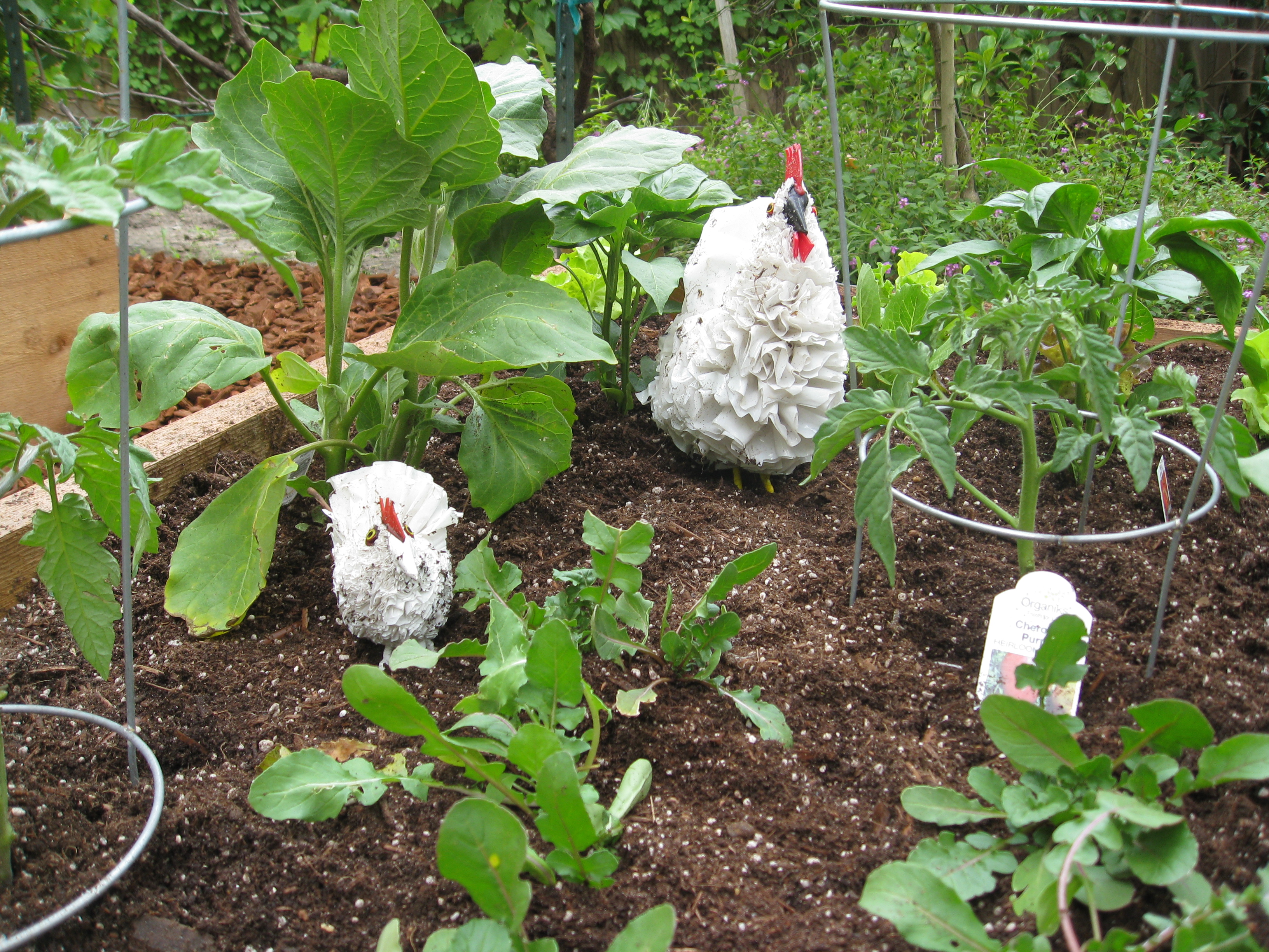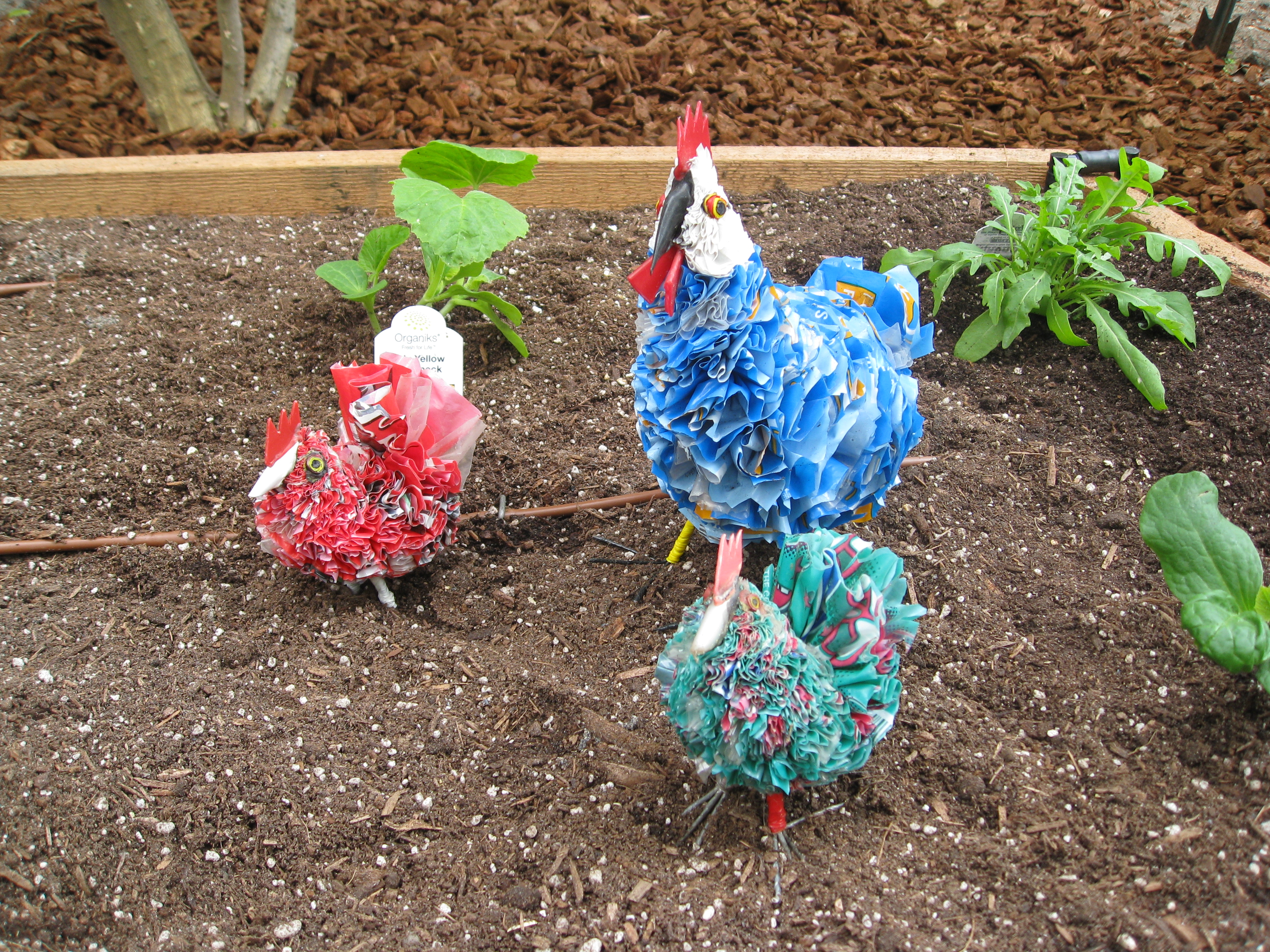 The client picked up a few adorable chickens made from recycled plastic bags while on a recent trip abroad. She and her daughter were so excited to station them in the garden, to keep watch over the veggies.