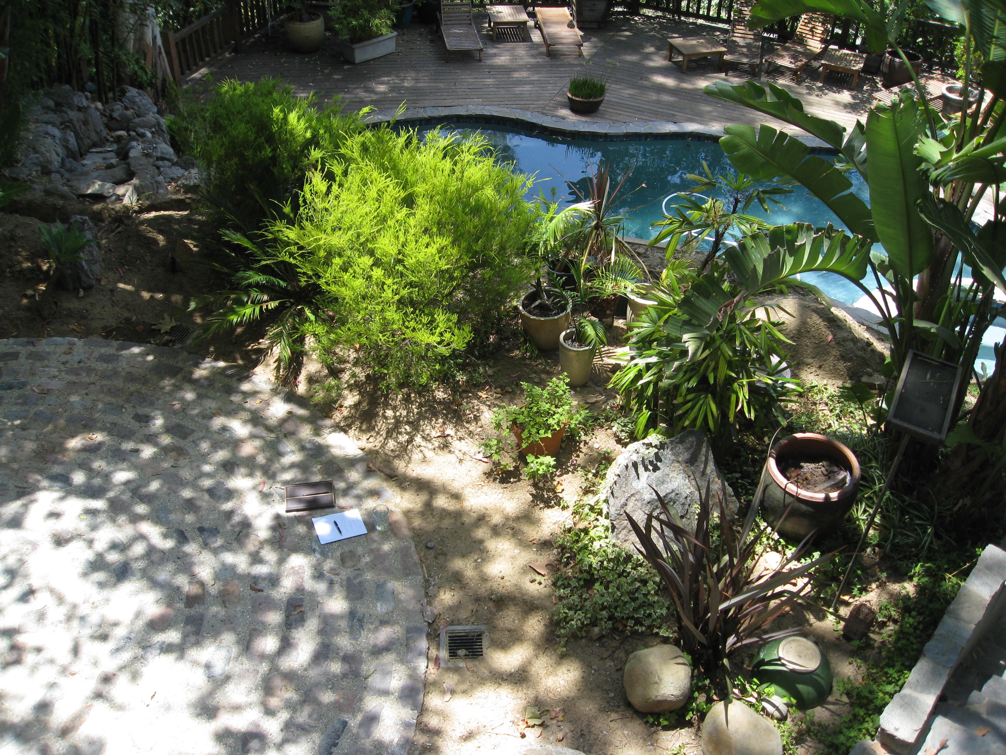 His new space had a great view and a small area for a vegetable garden. The style of the home is woodsy and casual, overlooking a pool and well-established trees. The garden space needed to be cleared to make room for our garden beds.