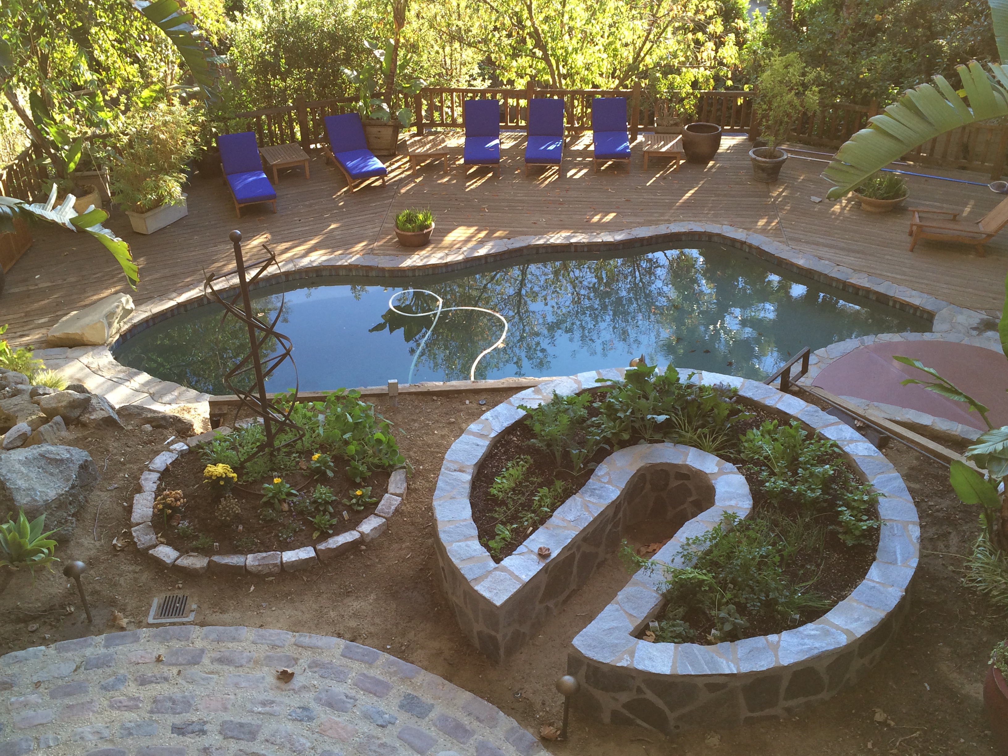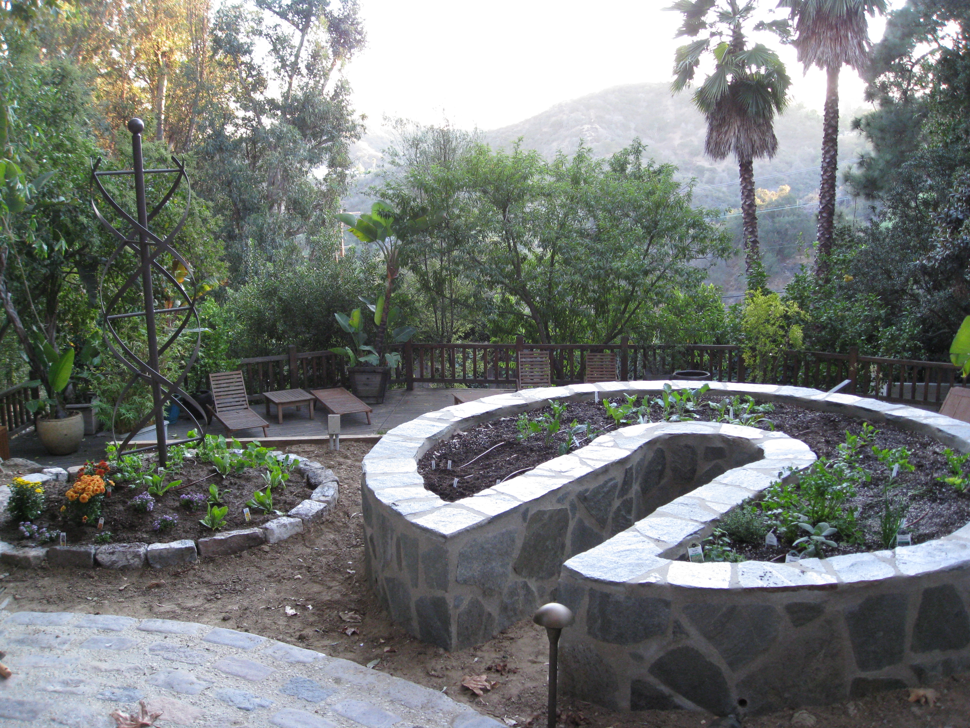 There was other work being done on the property at the same time, so Jesse’s contractor, Mark Haddawy and his crew built the keyhole garden bed. Then our crew got to work digging out roots, conditioning the soil, laying drip irrigation and grading.