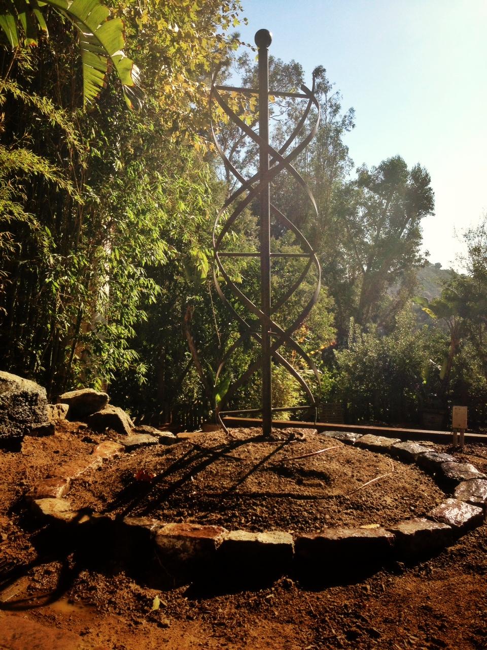 Jesse saw a picture of a helix-shaped trellis that he loved, but it wasn’t available any longer. So we had one custom made to his specifications for the flower bed. We used stone found on site to make a simple border.