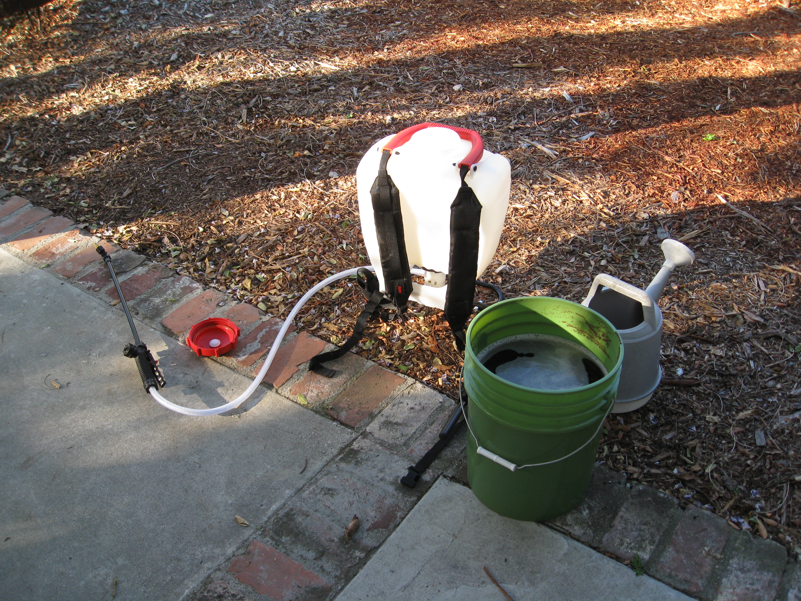 We sprayed down all our veggies and fruit trees, then added a soil drench to all beds to inoculate our existing soil with a fresh batch of microbes. Be sure to clean all your equipment immediately following use. Residues breed anaerobic bacteria, which is bad for plants and soil.