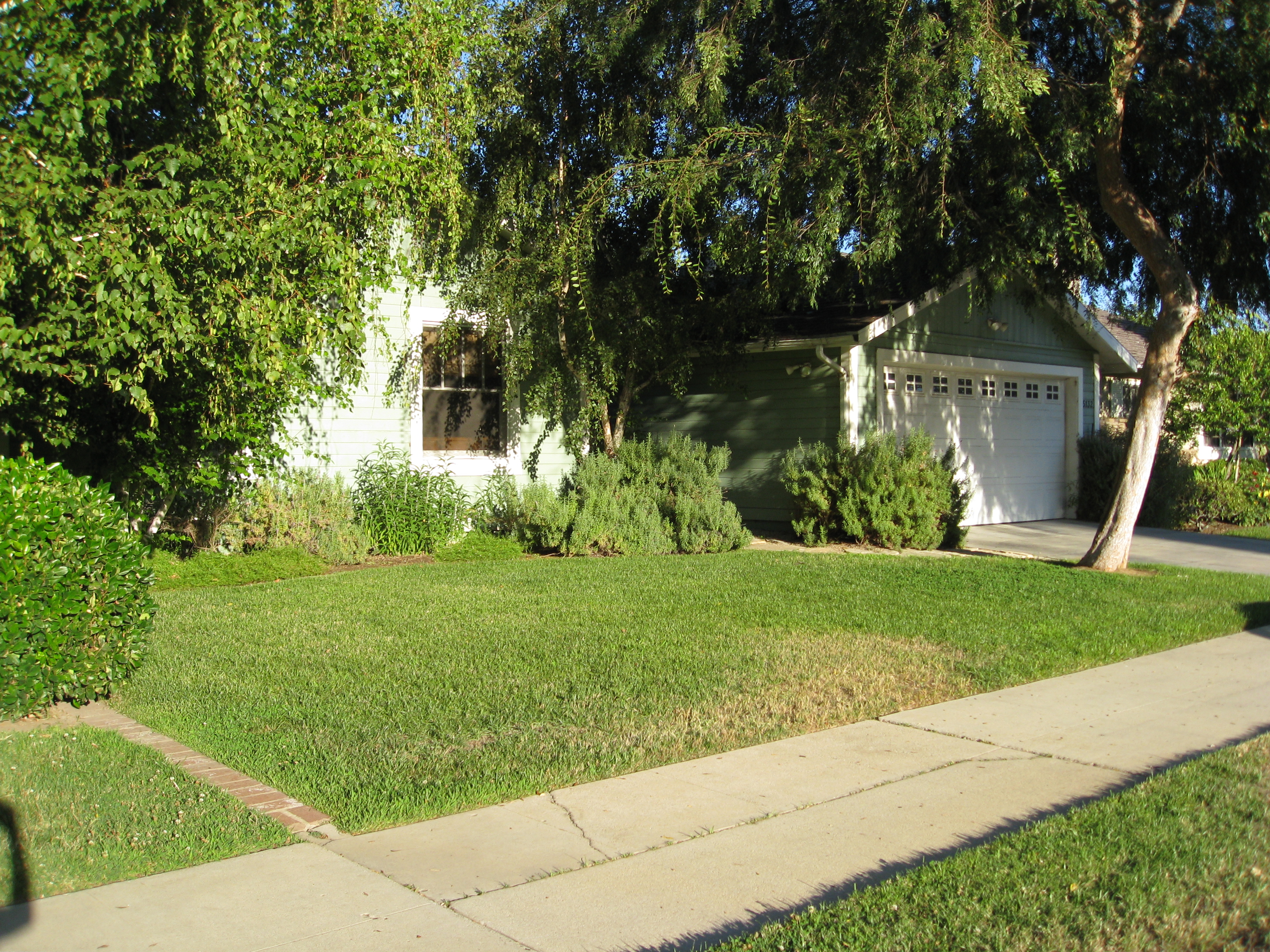 Drought tolerant plants like penstemon, calandrinia, oat grass, blue fescue, coreopsis, dymonida, foxtail agave, lavender, rosemary and Mexican bush sage will eventually fill in the area in front of the house with color and texture.