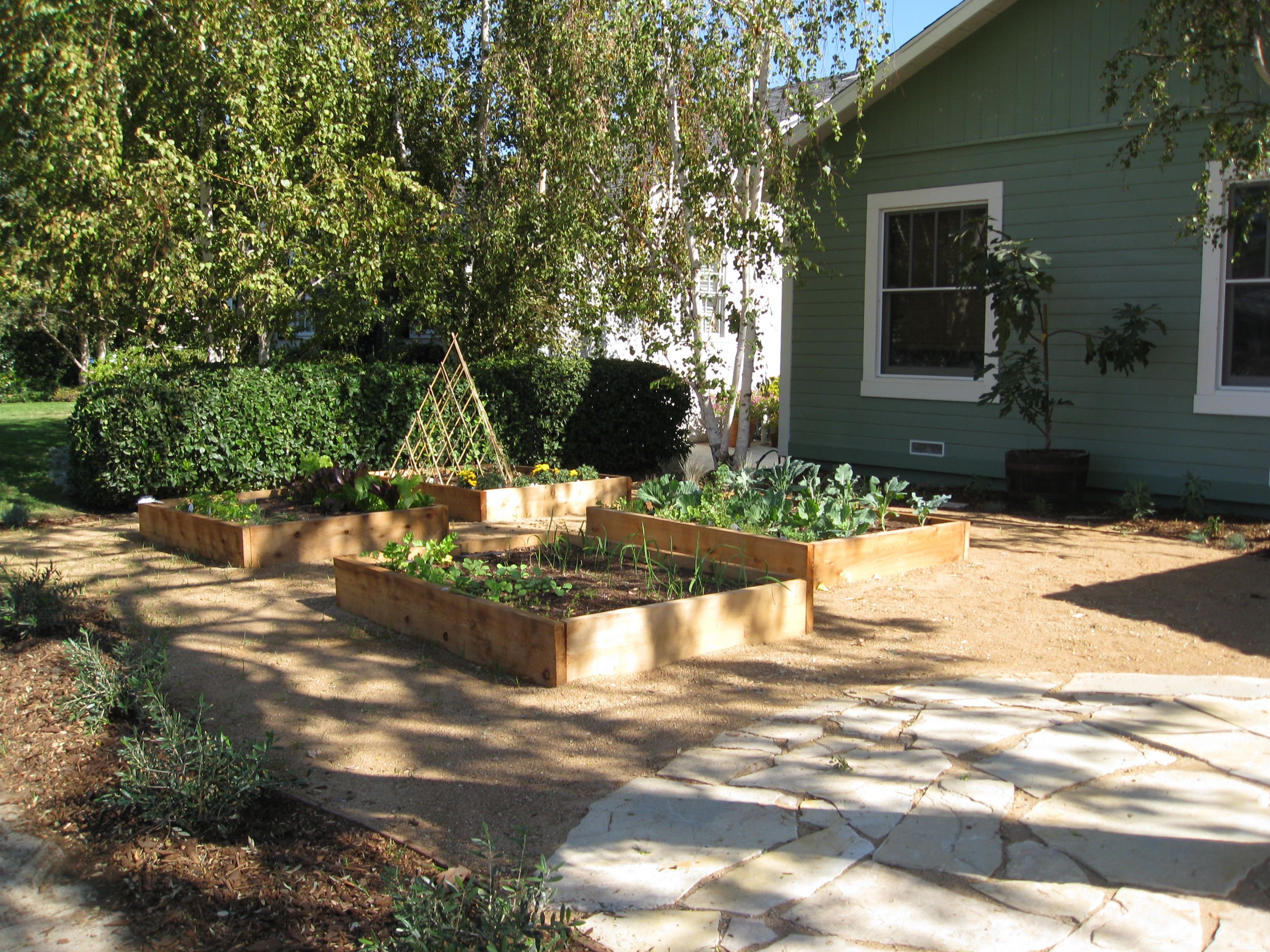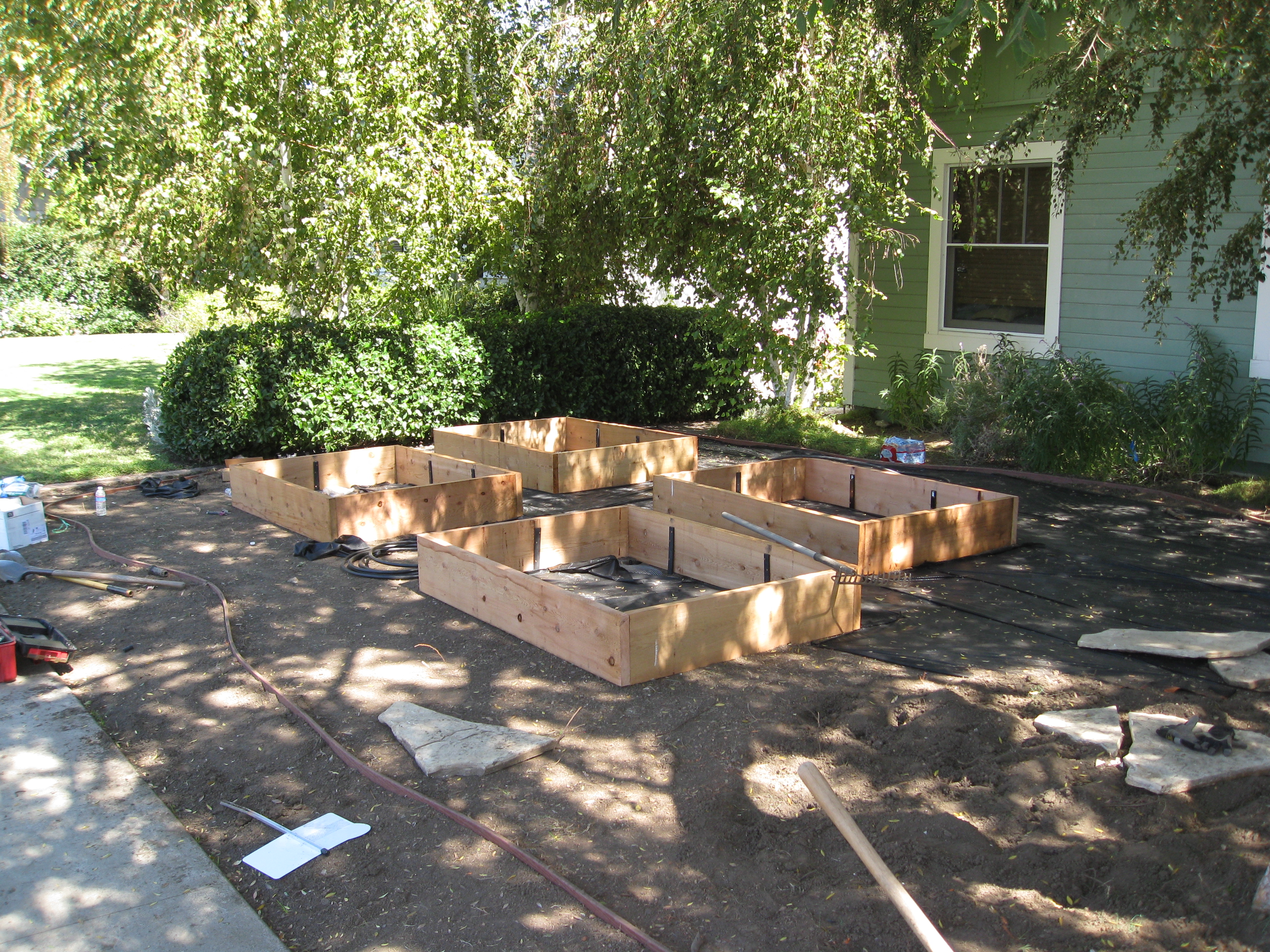 After tearing out the lawn, we allocated space for 4 raised beds. The family will grow flowers and veggies year-round here. Drip irrigation in each bed makes watering efficient and effective.