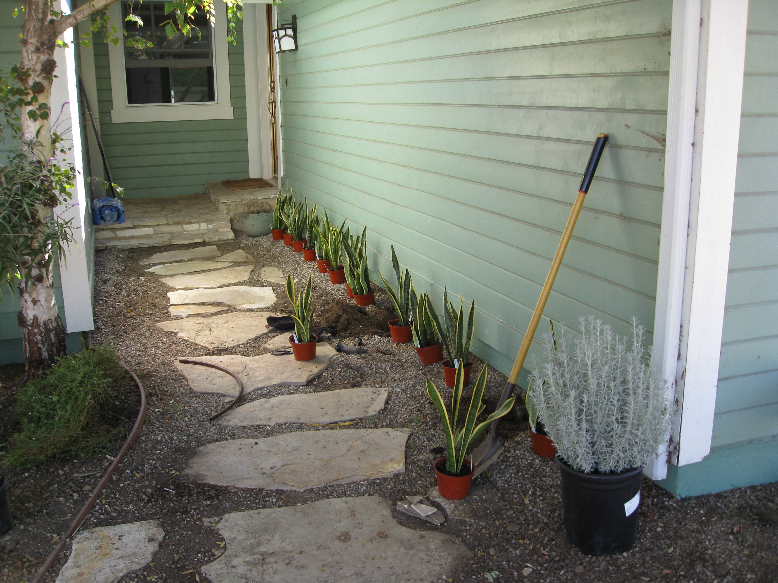 The shady walk to the front yard needed some green, so we lined the path with Mother-in-law’s tongue (Sansevieria trifasciata) to brighten things up. We removed the lavenders growing in the shade that clearly didn’t like their home, and added new lavender to sunnier areas.