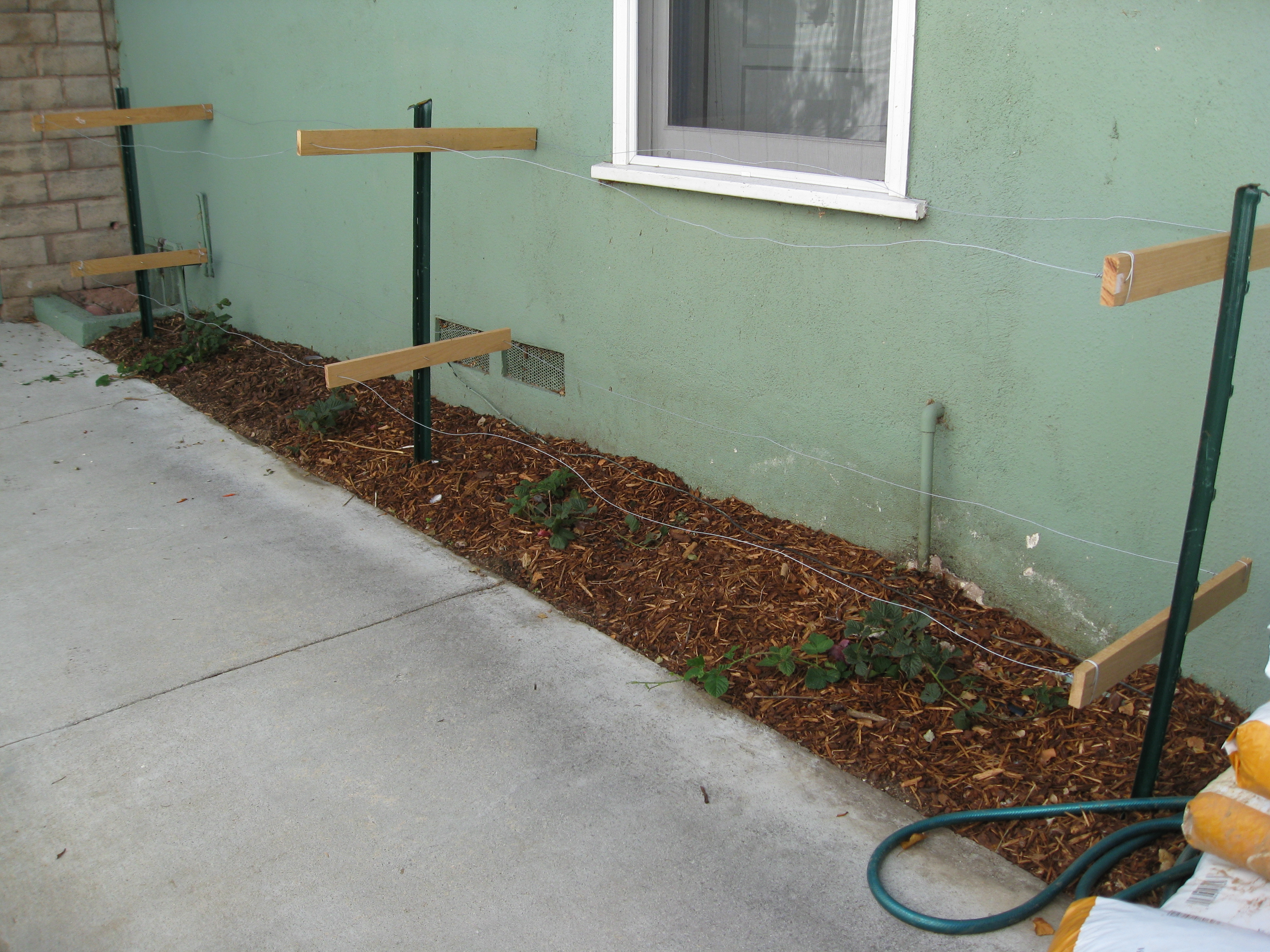 We used an inexpensive trellis system that will eventually guide the blackberries up instead of out, allowing access through the back gate more easily.