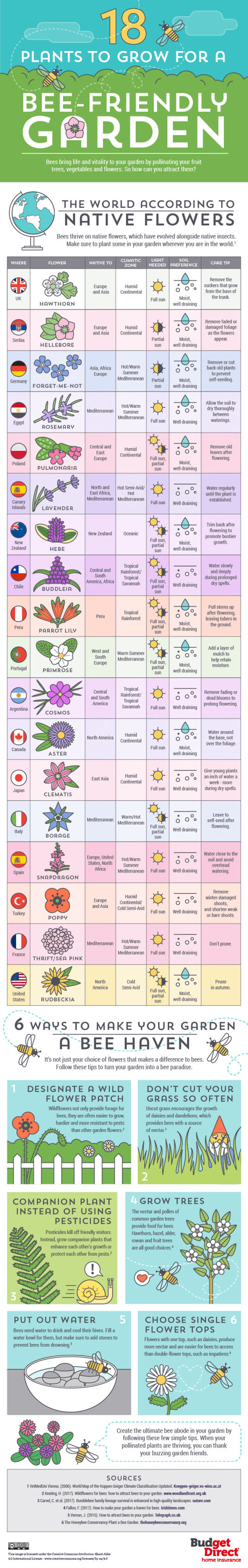 Today’s post includes an infographic sent by Budget Direct down under. It shares how to create a bee-friendly garden for your local pollinator population. While here at Gardenerd we always recommend starting with native plants for your particular climate and hardiness zone, here are plants from around the world that will help keep bees and other pollinators well-fed during the year.