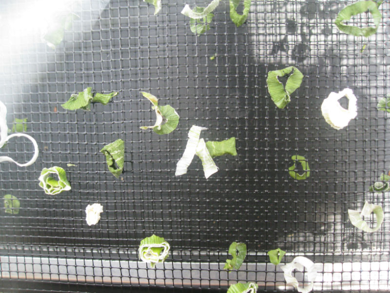 Notes: about half way through drying time (the halfway point in this case was about 7 hours) rotate trays. You’ll also see that we didn’t separate whites from greens, a mistake we won’t make again. The whites were still soft after many of the greens were dry and brittle.
