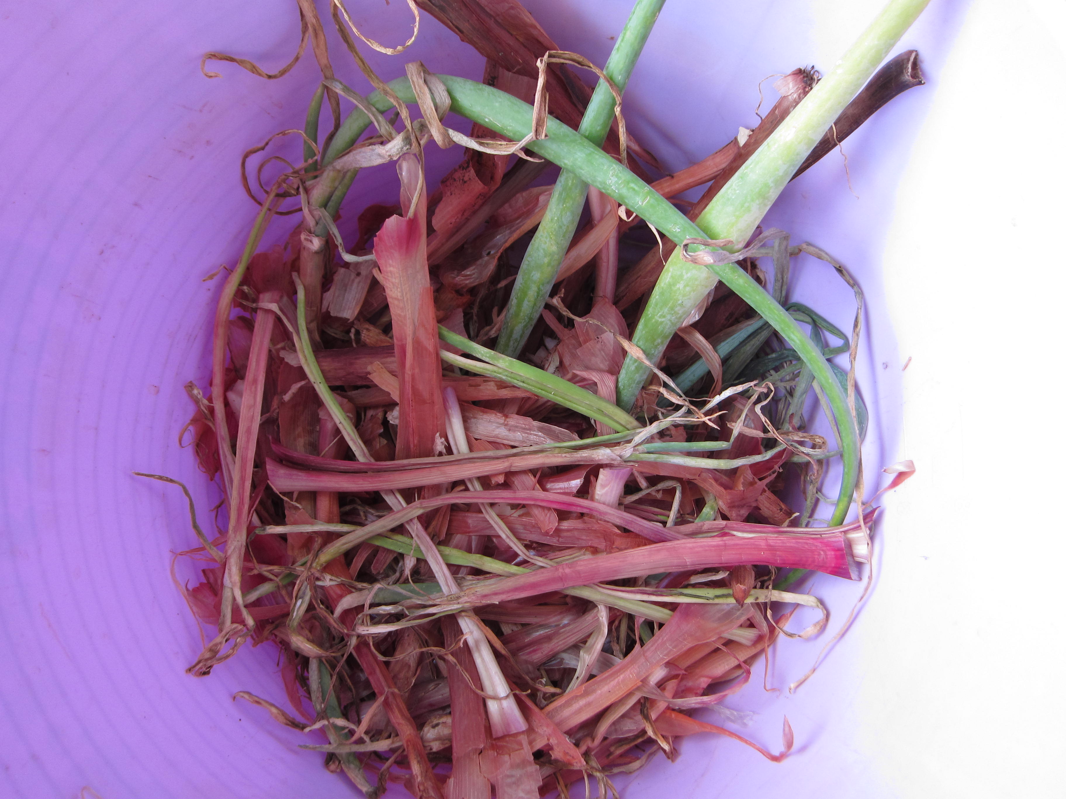 Trim off skins, roots, and stems. You can use these for stock later or feed them to your compost bin.