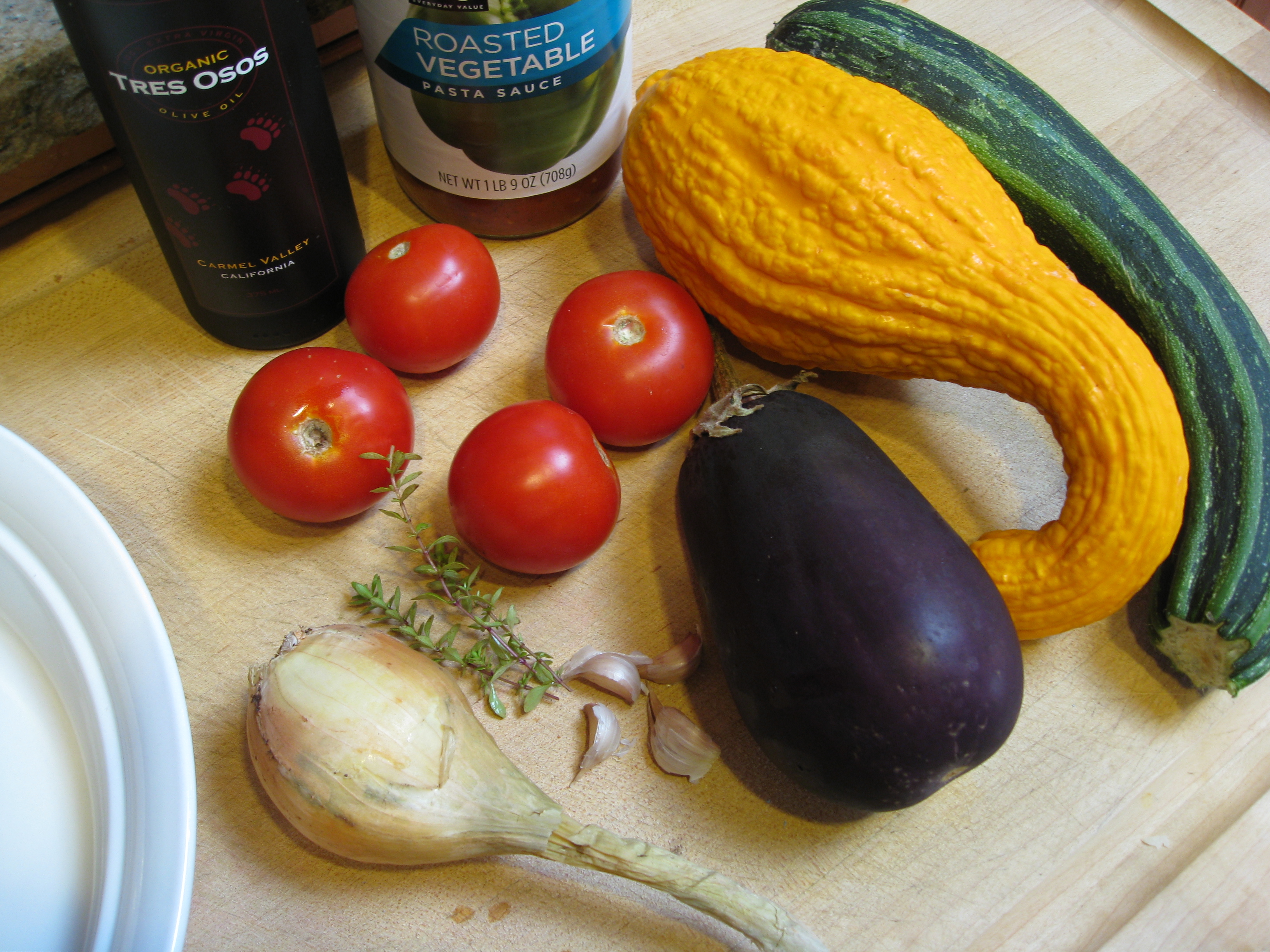 The original recipe called for tomato puree, but we had a jar of pasta sauce on hand, so we used that instead. We swapped out red pepper for tomatoes, but kept the other ingredients the same. Eggplant (a gift from a fellow gardenerd), zucchini, yellow crookneck, half an onion, 2 cloves of garlic, and a sprig of thyme.
