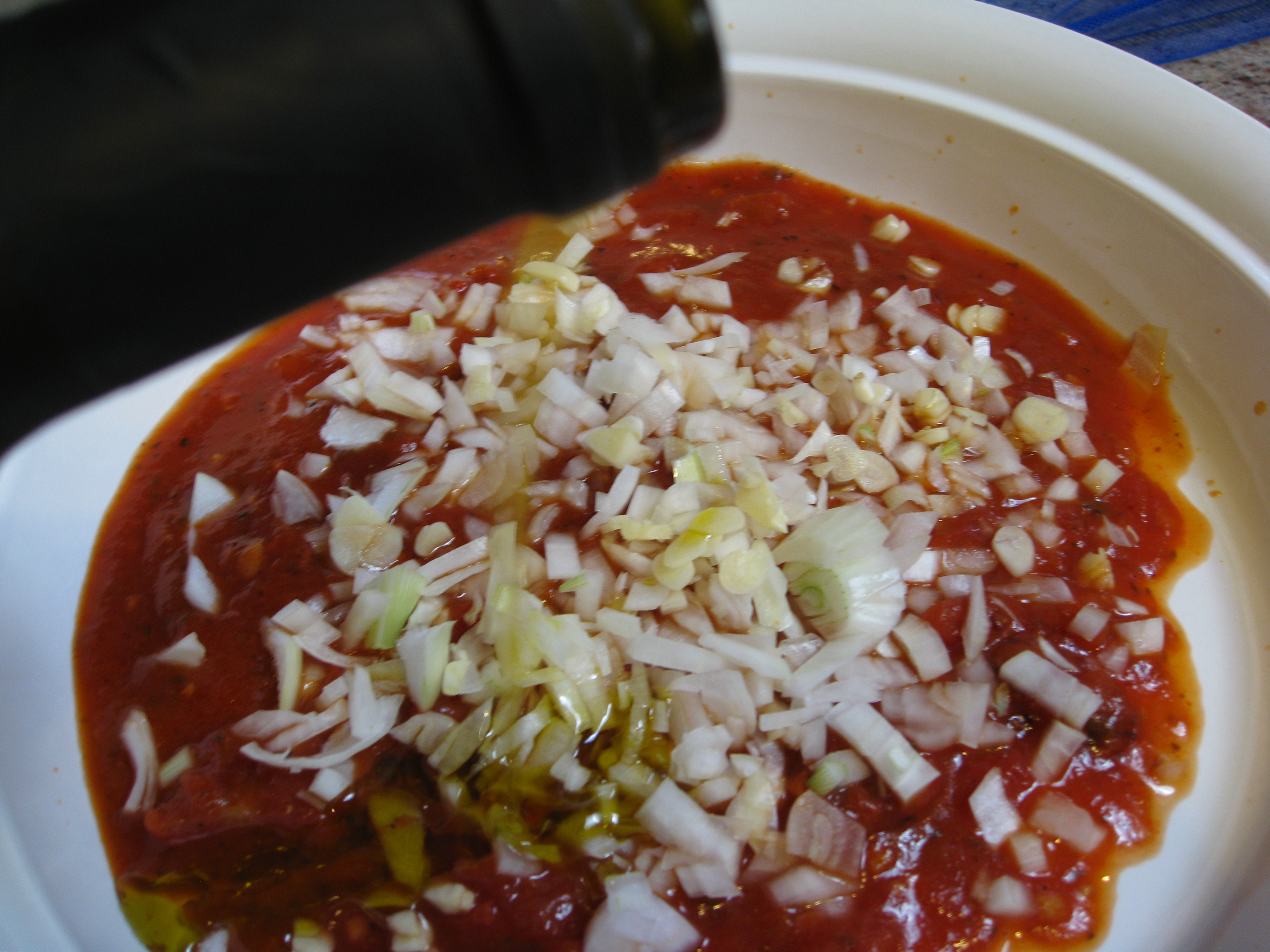 “Pour tomato puree into bottom of an oval baking dish, approximately 10 inches across the long way. Drop the sliced garlic cloves and chopped onion into the sauce, stir in one tablespoon of the olive oil and season the sauce generously with salt and pepper.