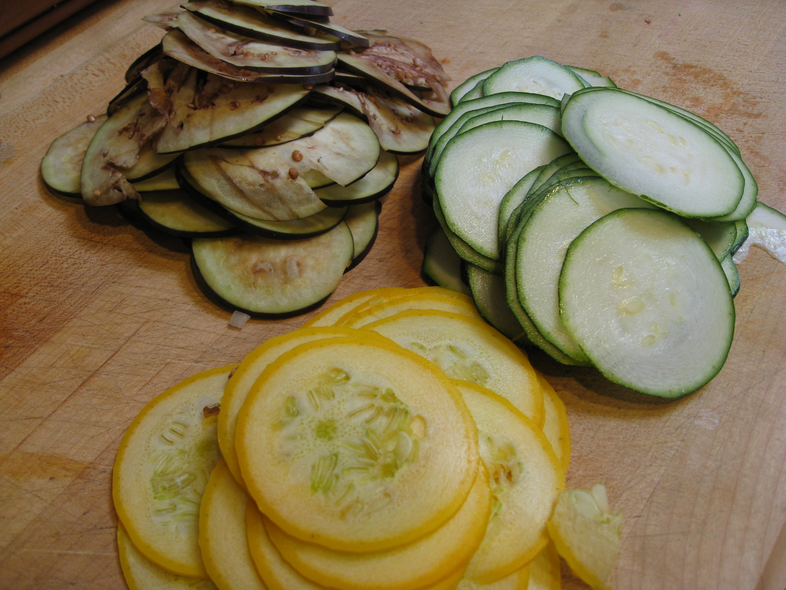 Notes: Our eggplant was a little bitter, so next time we may peel it first. Never the less, it’s a beautiful and easy way to serve summer squash when you’re sick of summer squash.