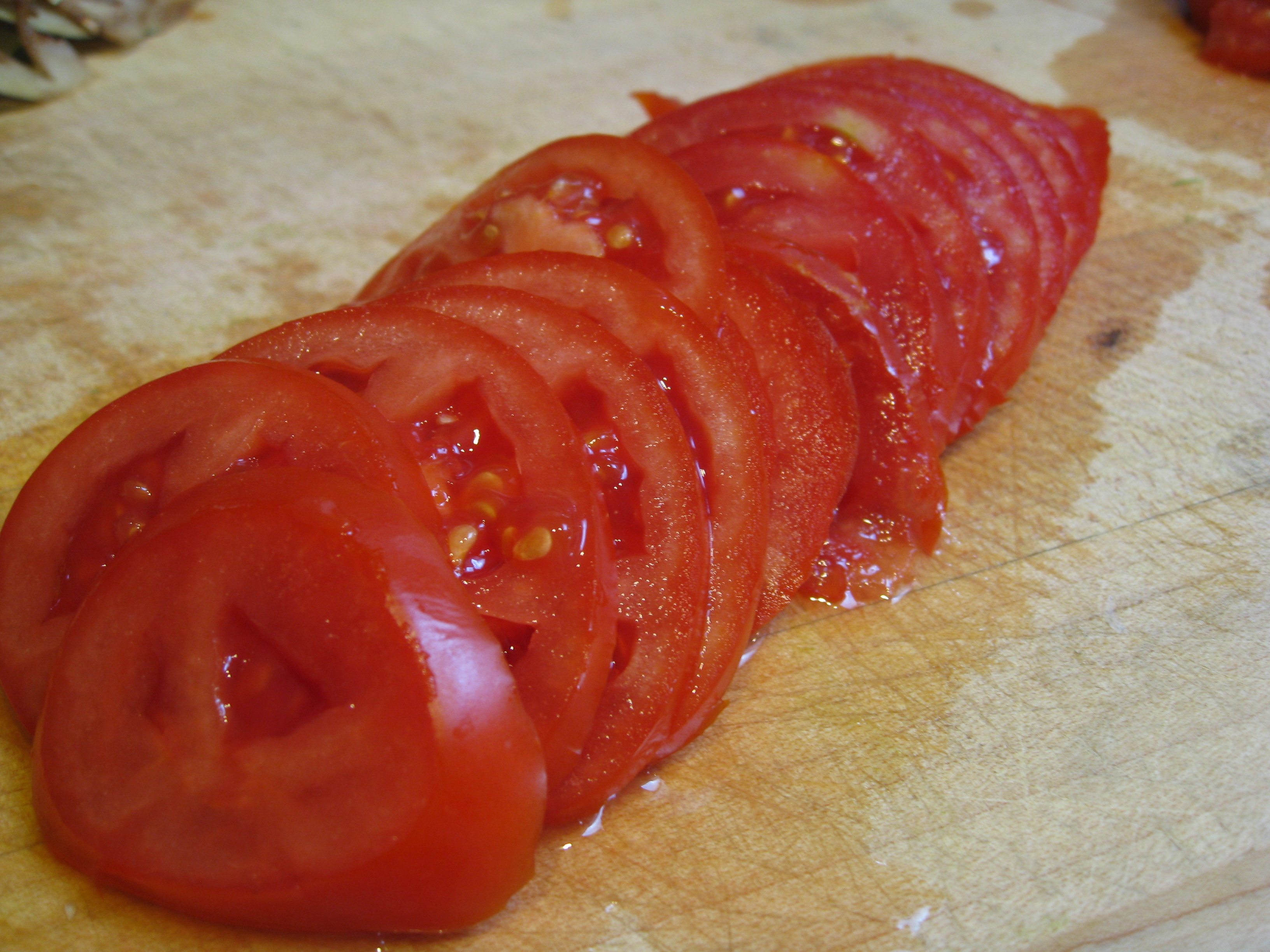 Our tomatoes were too tender for the mandoline (or the blade wasn’t sharp enough, who knows). We sliced them with a serrated knife by hand, and added them to the pile of ingredients.