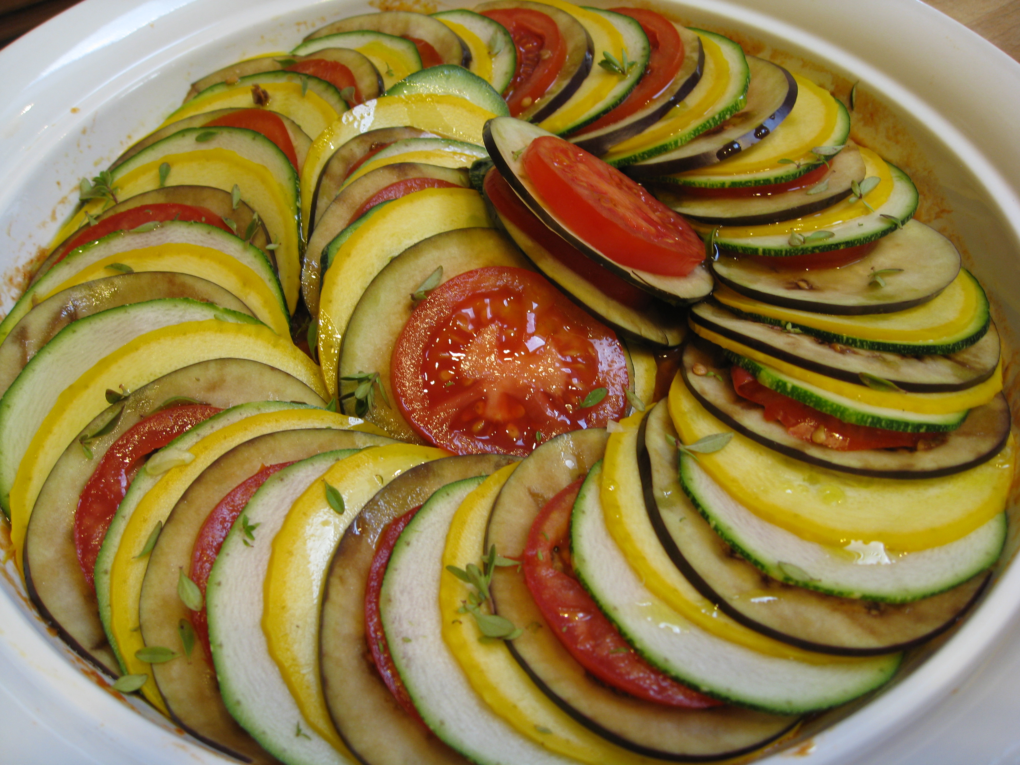 Atop the tomato sauce, arrange slices of prepared vegetables concentrically from the outer edge to the inside of the baking dish, overlapping so just a smidgen of each flat surface is visible, alternating vegetables. You may have a handful leftover that do not fit.