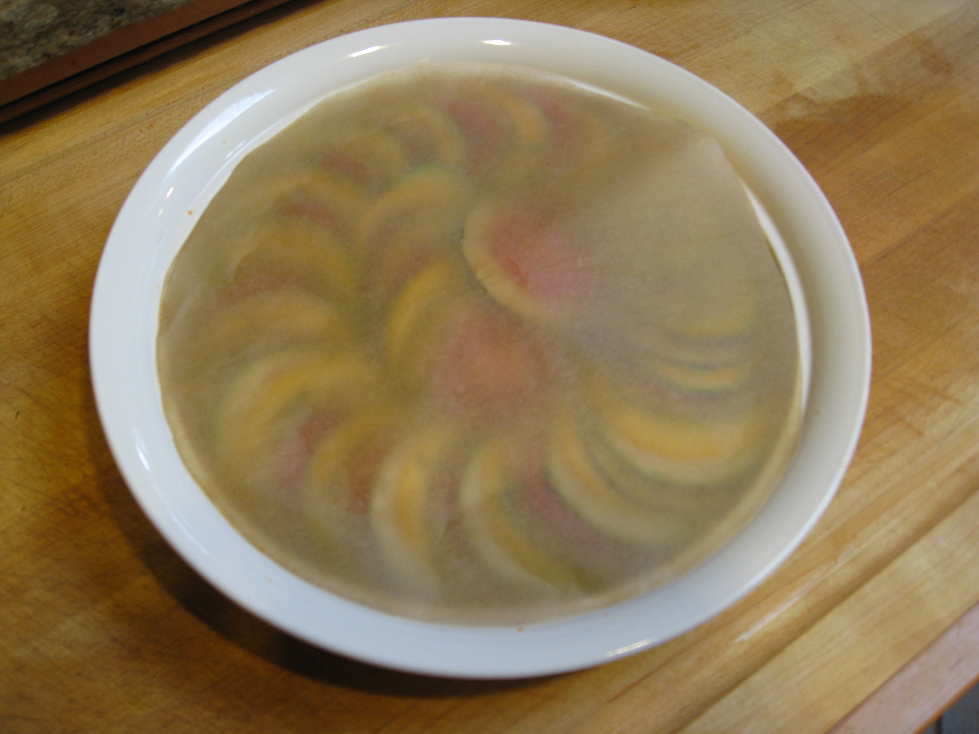 Cover dish with a piece of parchment paper cut to fit inside. (Tricky, I know, but the hardest thing about this.)