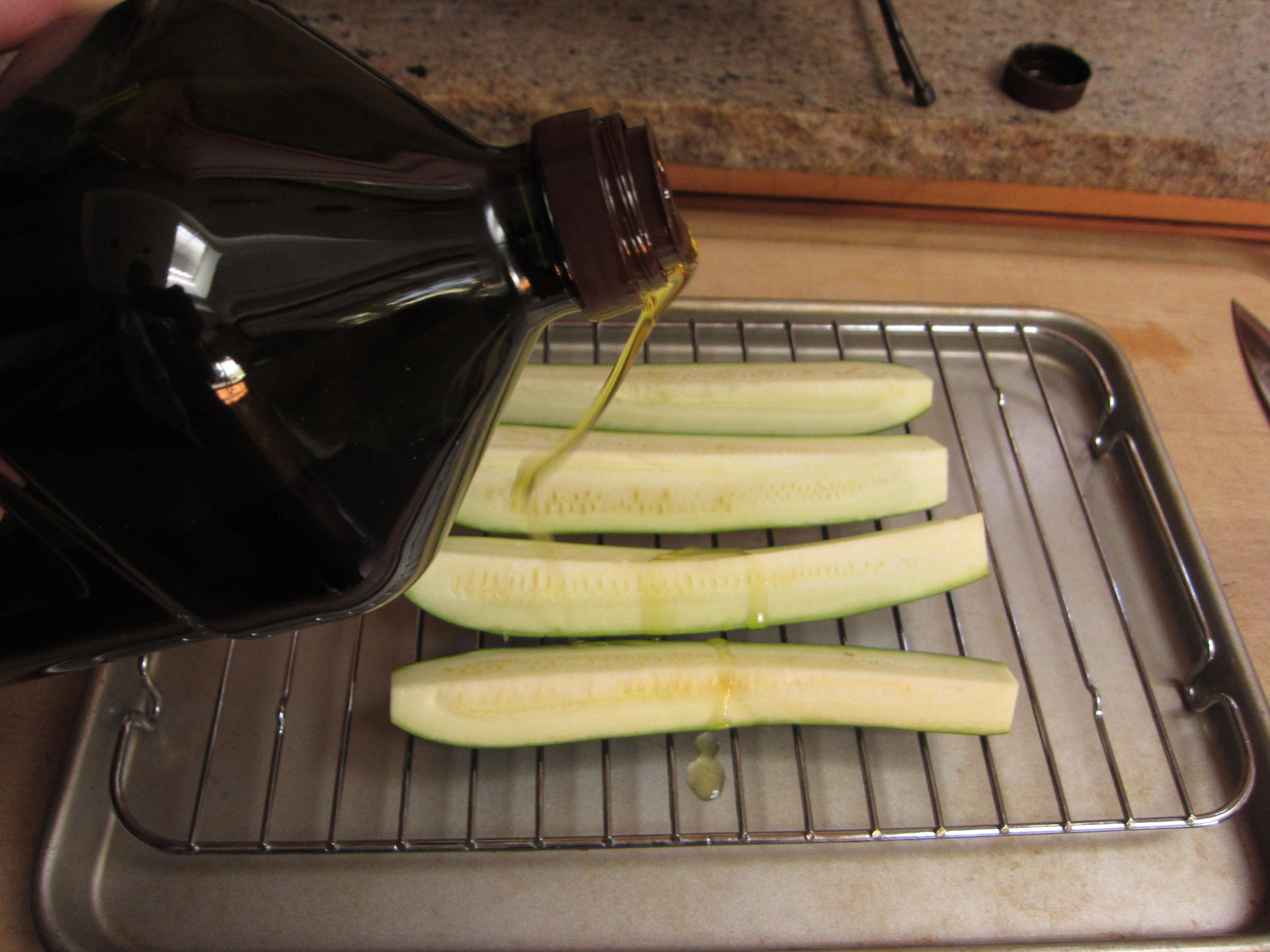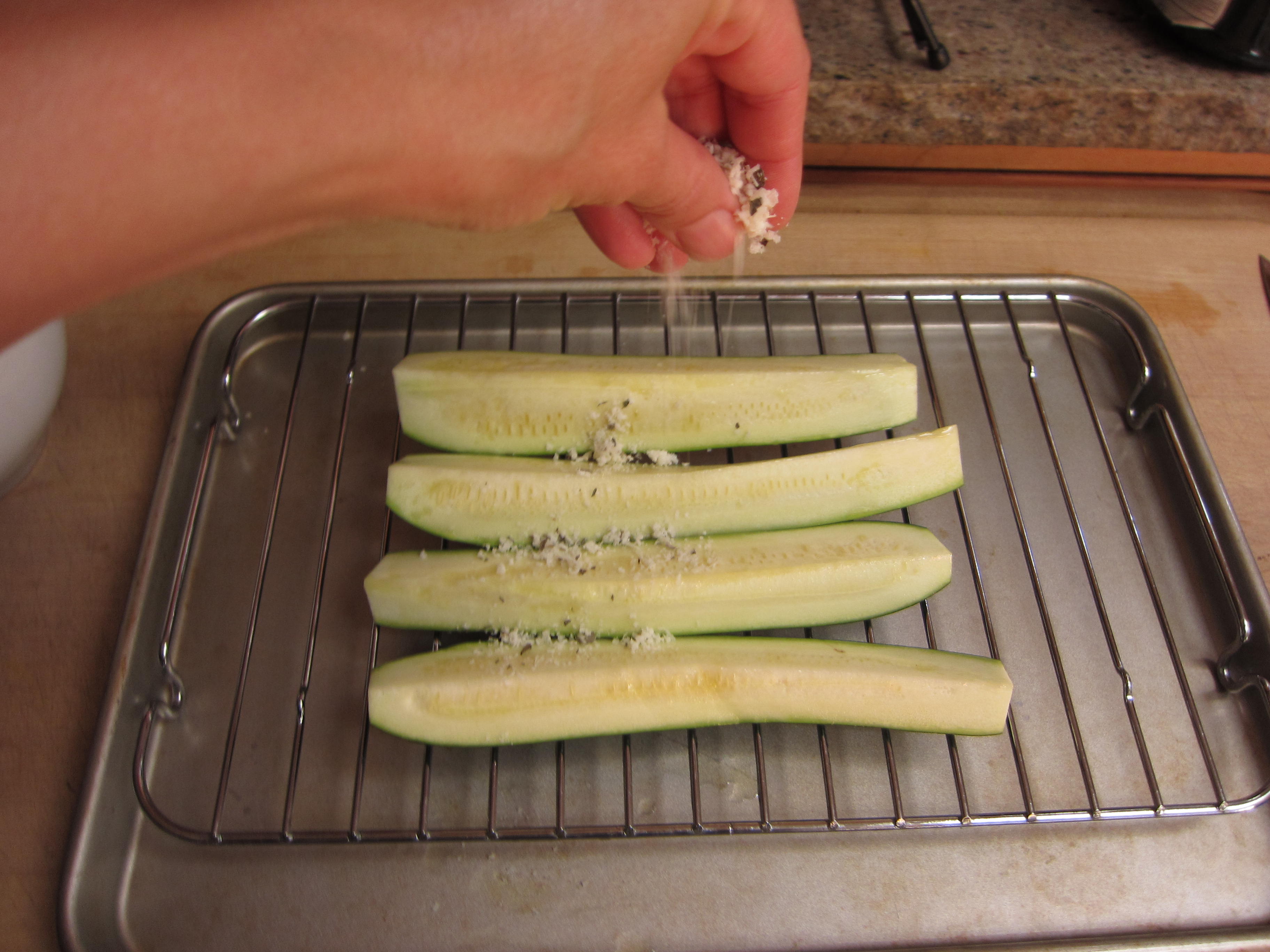 The author suggests baking your zucchini on a wire rack. Make sure it is oven safe. I don’t recommend using a coated bakers rack unless you know it can tolerate high temps. We used a metal rack from a roasting pan and placed it on a rimmed cookie sheet (keeps it from sliding off, which it wants to do).