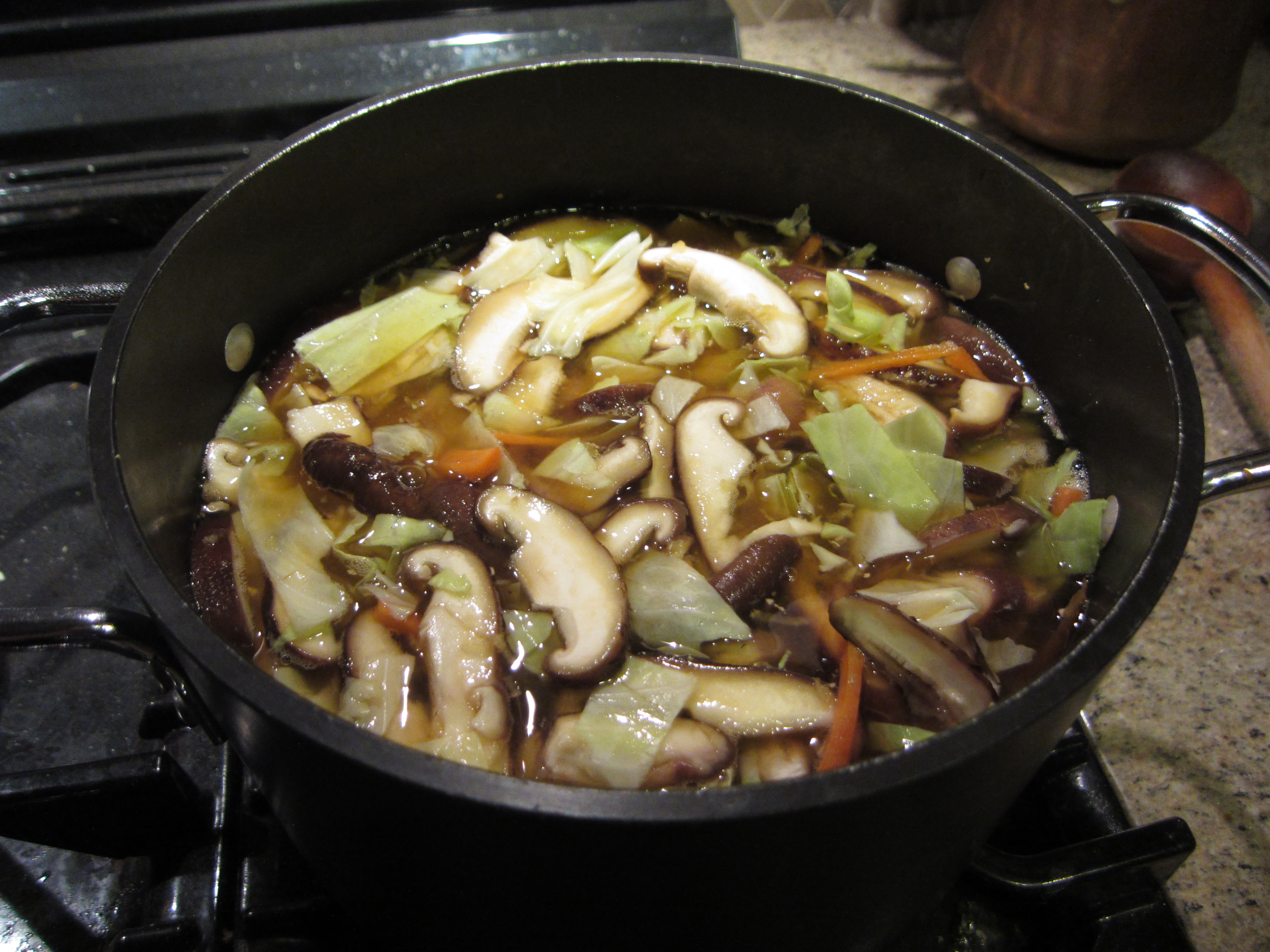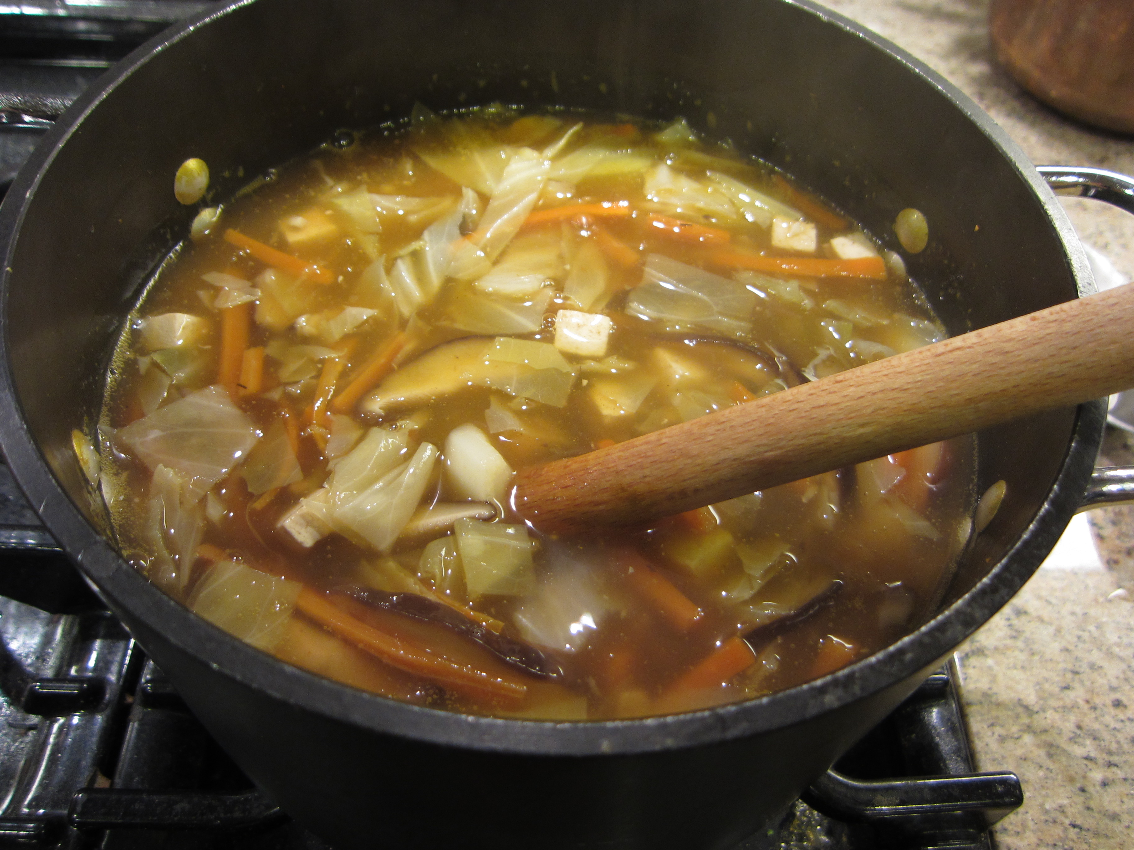 Combine in a medium stock pot: vegetable stock, cabbage, mushrooms, carrots, bamboo shoots (if using), tamari sauce, and ginger. We left out the bamboo shoots because, let’s face it, on their own bamboo shoots taste like vomit. Some things are better left alone.