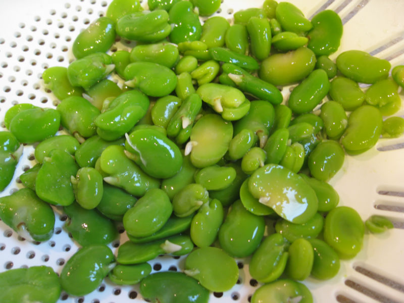 Drain fava beans and plunge into ice bath for another 3 minutes. Fava beans have to be shelled again because the inner pod is not edible. After blanching, the second shelling will be easier.
