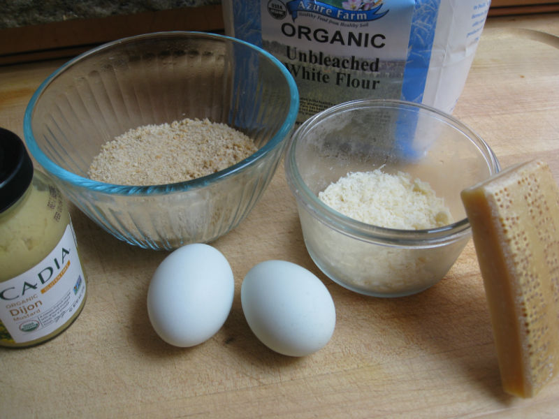 Other ingredients include eggs, breadcrumbs, cheese, mustard and flour